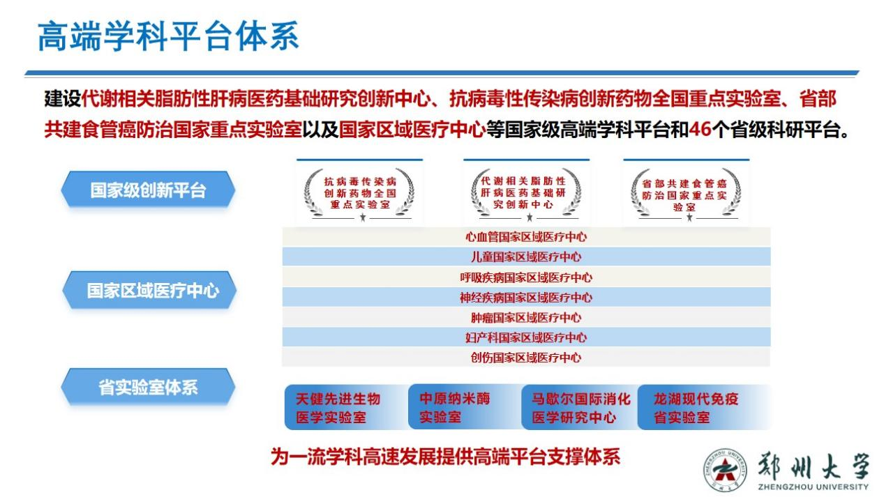 聚集国际一流人才,以重大项目为纽带,形成“项目引领、任务导向、协作攻关、开放共享”的实验室运行新机制,打造富有创新活力的国家战略科技支撑平台体系。不断优化省部共建食管癌防治国家重点实验室共享机制,建设抗病毒性传染病创新药物全国重点实验室、代谢相关脂肪性肝病教育部医药基础研究创新中心,加快建设天健先进生物医学实验室、龙湖现代免疫实验室、中原纳米酶实验室和马歇尔国际消化医学研究中心,积极筹建国家医学中心,打造国家级战略科技创新力量,形成层次清晰、布局合理、支撑有力的学科科研平台体系。