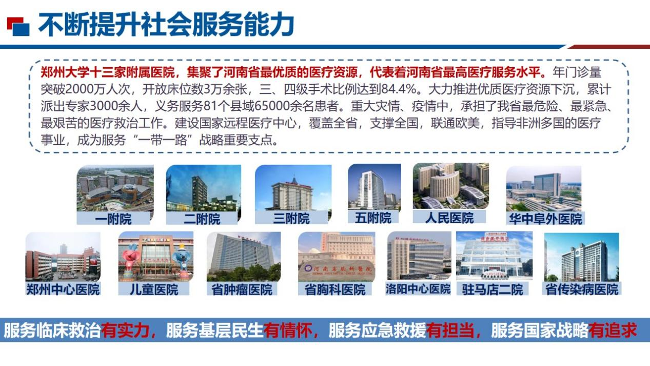 聚焦临床服务,推动附属医院高质量、集团化发展。目前共有附属医院13家,国家临床重点专科54个,依托附属医院建设的国家区域医疗中心达到7个,集聚了河南省最优质的医疗资源。临床服务能力不断提高,年门诊量突破2000万人次,三、四级手术比例达到84.4%,降低了省内病人省外就诊率(<5%),省外患者就医率超过10%。重组人nsIL12溶瘤腺病毒注射液获得国家药品监督管理局药品审评中心Ⅰ类新药临床试验许可,目前已进行5项临床医生发起的临床试验(IIT),均取得了良好的安全性及抗肿瘤治疗效果,并已治愈多例脑胶质瘤和皮下软组织肿瘤患者,得到各级领导的关注和支持。