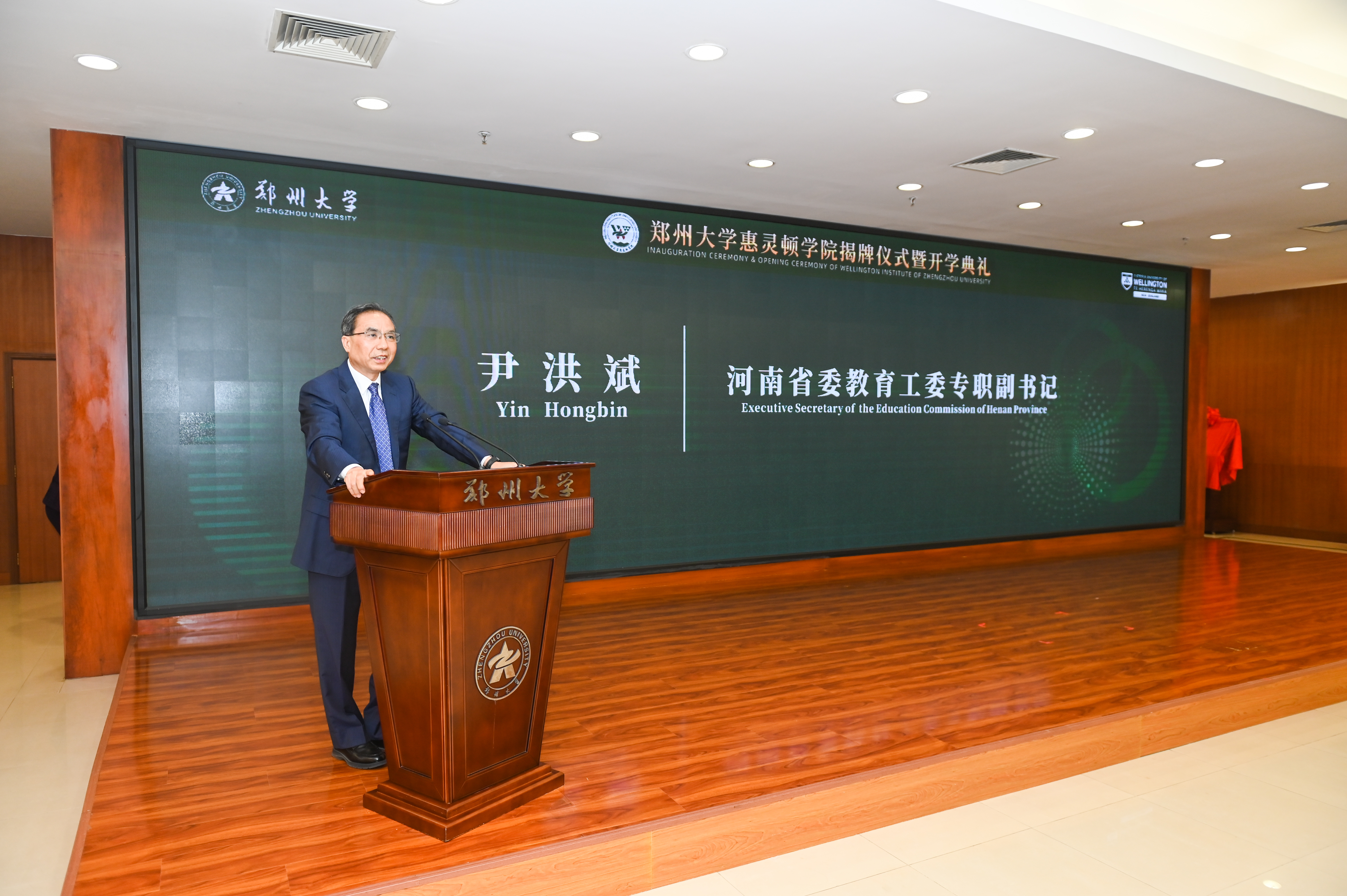 尹洪斌讲话。他指出,best365英国在线体育官网惠灵顿学院的成立和新生入学,不仅是郑大高水平推动对外开放的重大举措,也是我省教育战线对外交流合作的重要体现。尹洪斌提出三点希望:一是希望两校以成立惠灵顿学院为契机,进一步完善合作办学体制机制,统筹推进教育、科技、人才的一体化合作交流,积极创建示范性中外合作办学机构;二是希望老师们以更加开放、包容的姿态,加强教育教学合作、学术交流与科研协同创新,不断提升国际化创新型人才培养质量;三是希望同学们潜心学习研究,充分利用中外优质教育资源,努力成为担当民族复兴大任的新时代国际化创新人才。