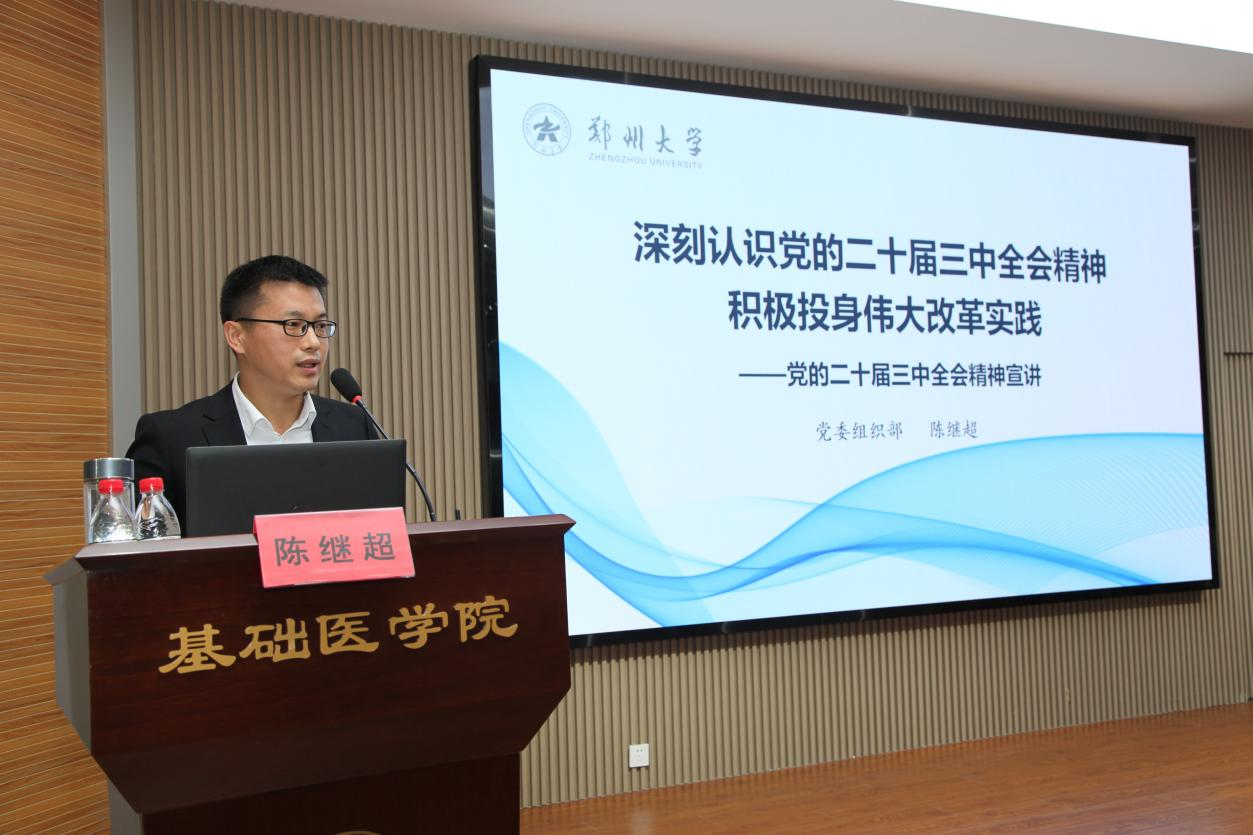 为深入学习贯彻党的二十届三中全会精神,根据校党委统一部署,9月25日,best365英国在线体育官网学习贯彻党的二十届三中全会精神宣讲团成员、校党委常委、组织部部长陈继超到基础医学院作宣讲报告。学院党政班子成员、全体教职工以及部分学生代表150余人参加。