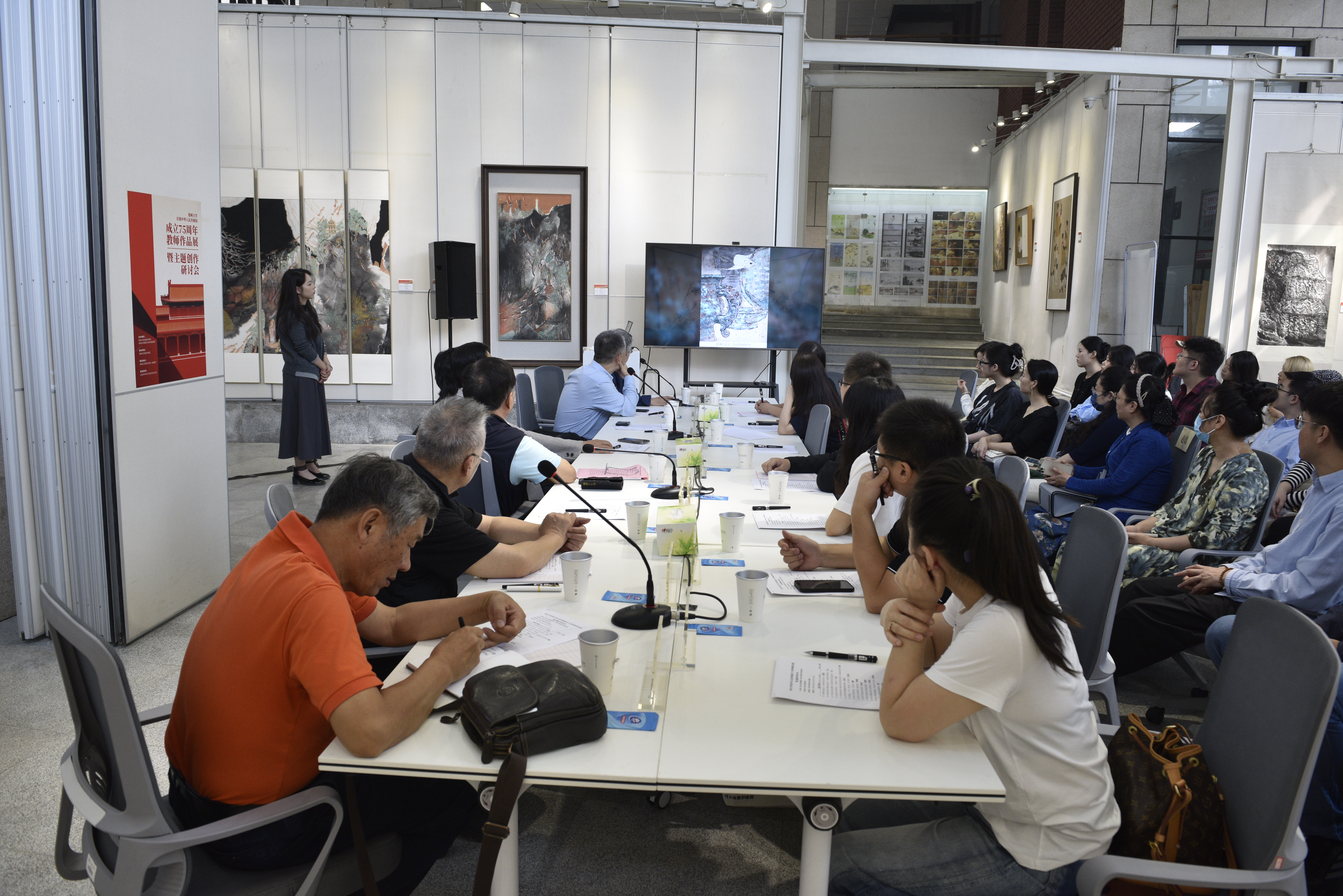 业内专家、美术学院师生等50余人在展览开幕式后进行了主题性创作研讨。大家围绕主题性艺术创作,高校艺术教育与创作的关系、技法与理论的实践结合等问题各抒己见,进行了深入探讨。并提出主题性创作应加强与时代的融合,多层次多视角的关注当下社会,注入情感与想象力,进行多元化的表达等切实中肯的意见。同时围绕艺术创作的“技法”与“内容”如何互相支撑,艺术学教师的“艺术家”与“教师”身份如何兼顾融合等问题进行了交流。