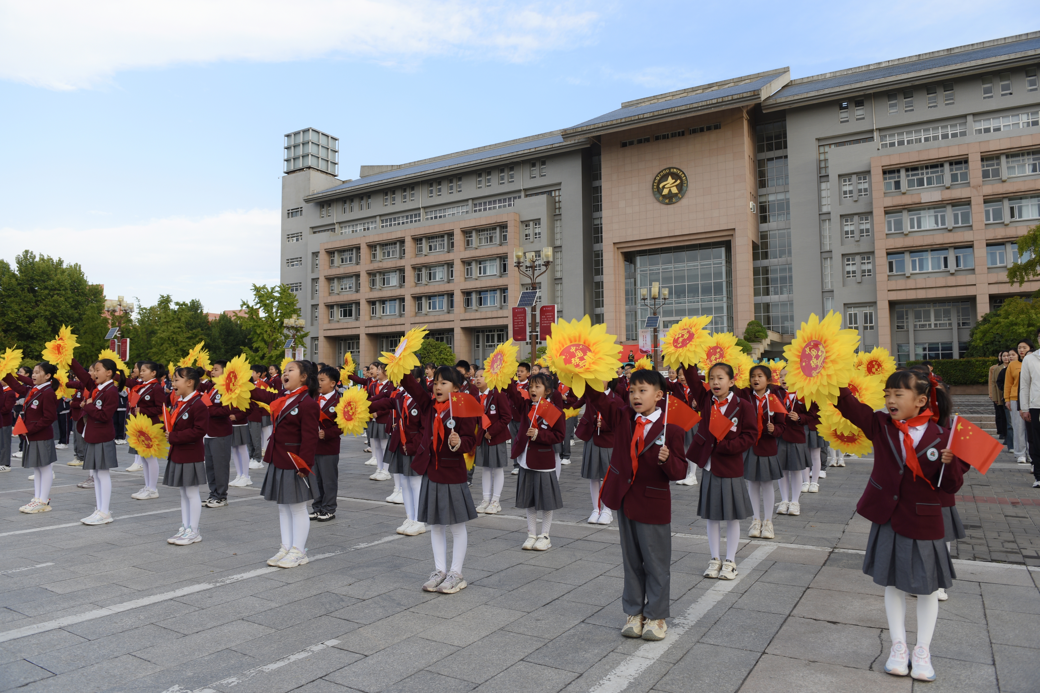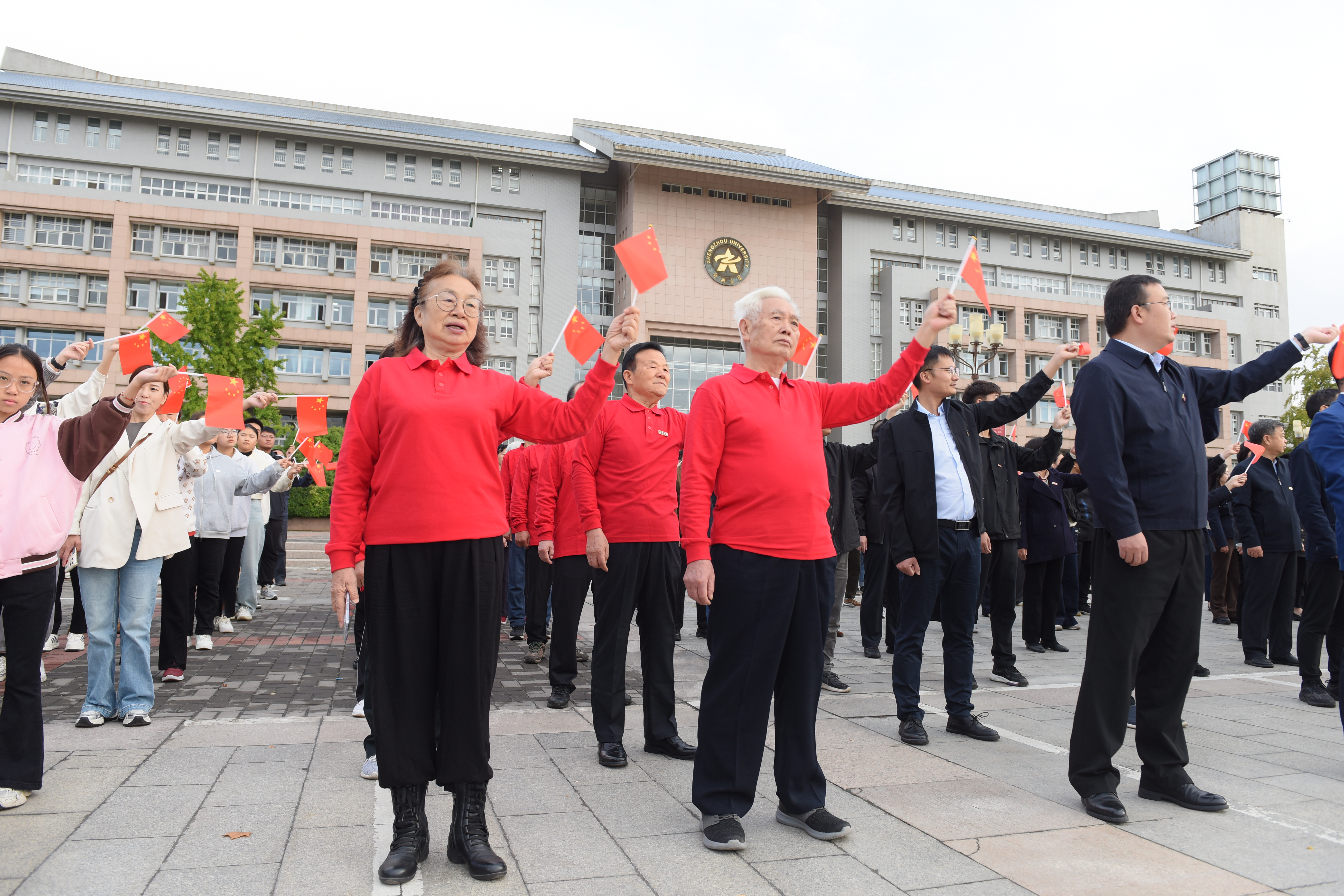红歌嘹亮颂祖国,激昂旋律迎国庆。四个表演方队挥舞国旗,唱响红色歌曲,用歌声表达郑大师生对祖国深深的热爱和美好的祝愿。“我何其幸生于你怀,承一脉血流淌……”附属小学的孩子们手持太阳花迎接旭日东升,用稚嫩而坚定的歌声齐唱《万疆》,如同在祖国花园里幸福成长的花朵,红色的种子在心中生根发芽。附属中学学生用充满激情的手势舞蹈、铿锵有力的音律说唱《少年中国说》:“少年自有少年狂,身似山河挺脊梁!”每一个音符都跳跃着青春的活力,每一句歌词都唱响了新时代的少年风采。大学生方队和教师方队引吭高歌《没有共产党就没有新中国》,展现了郑大学子“请党放心,强国有我”的昂扬奋发、挺膺担当。随着《今天是你的生日,我的中国》旋律响起,12位与共和国同龄的退休教职工身着红衣,与全场师生一起齐声合唱,深情告白祖国。护旗手高高托举巨幅国旗,从师生方阵上空缓缓穿过,与师生手中挥舞的数百面红旗交相辉映,现场呈现一片“中国红”,如同跳跃的火焰,点燃了师生心中的爱国热情。