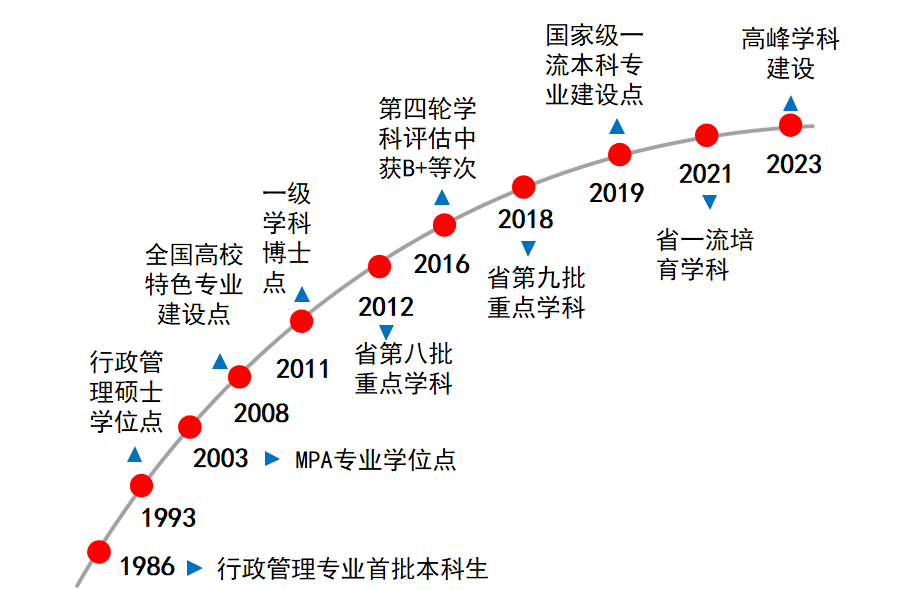 best365英国在线体育官网公共管理学学科1985年在全国高校率先设立行政管理本科专业,并于次年正式招生,1993年获批行政管理硕士学位授予权,2003年获批公共管理硕士(MPA)专业学位授予权,2006年获批公共管理一级学科硕士学位授予权,2011年获批公共管理一级学科博士学位授予权,2014年获批公共管理博士后科研流动站,2019年获批国家级一流本科专业建设点,2023年获批best365英国在线体育官网高峰学科建设。