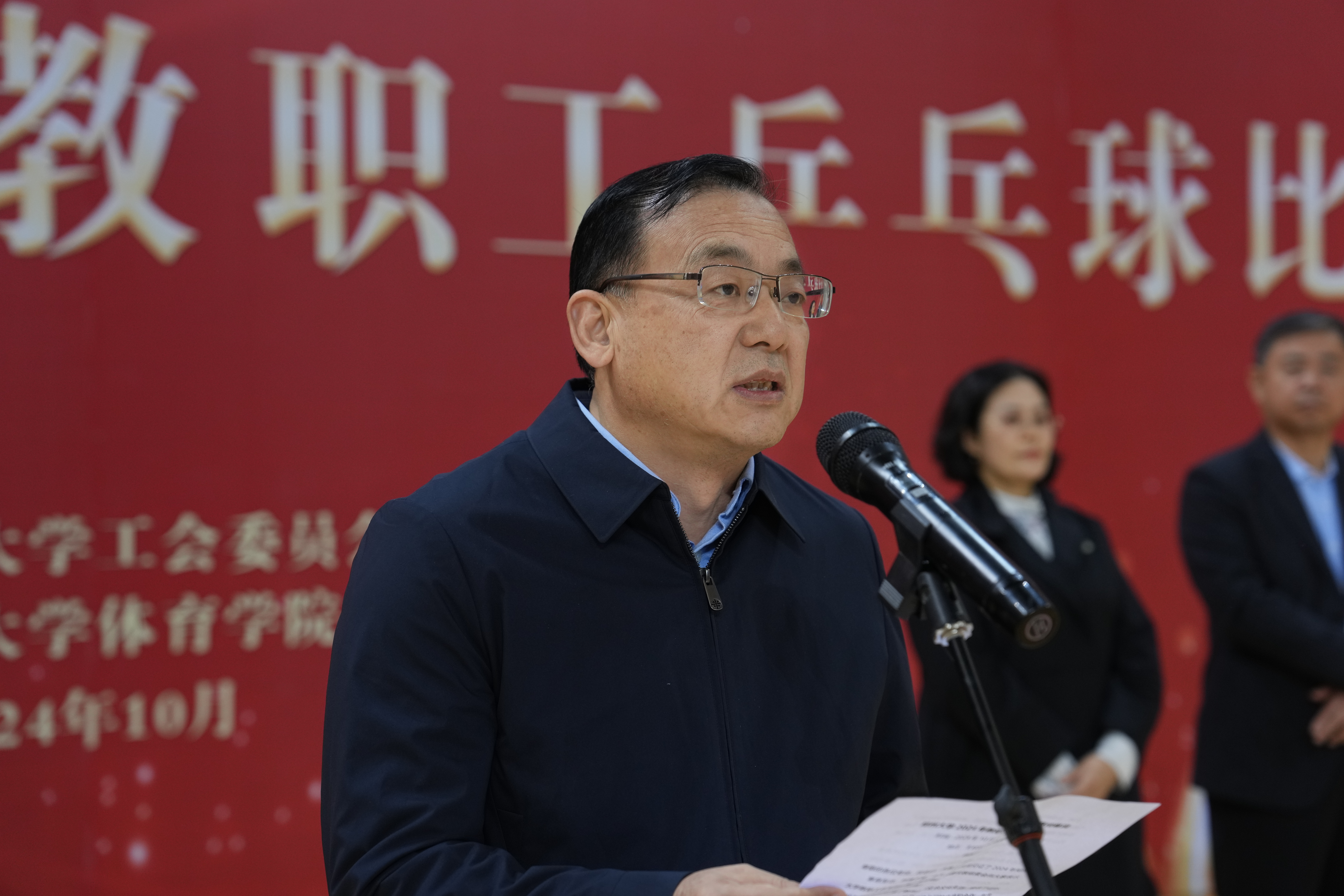 闭幕式上,韩国河致辞。他代表学校向取得优异成绩的代表队和运动员表示热烈祝贺,并对参与本次比赛的全体工作人员表示诚挚感谢。他强调,此次比赛旨在推动全民健身活动的开展,进一步树立健康生活、快乐工作的理念,希望大家在紧张工作之余,积极参加体育锻炼,不断提高身体素质,进一步提高体育文化感召力、影响力、凝聚力。同时,他肯定了参赛选手顽强拼搏的竞技精神和对乒乓球运动的热爱,鼓励大家继续热爱体育,保持健康,将比赛中展现的团结协作和拼搏进取的精神延续到今后的工作和生活中,以更加奋发向上的姿态投入到学校一流大学建设中去。(魏洪波 摄影)