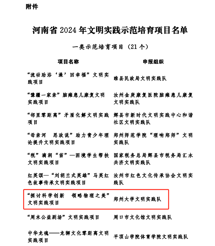 为深入学习贯彻习近平文化思想,推动新时代文明实践工作提质增效、走深走实,近日,河南省精神文明建设办公室发布了《关于公布河南省2024年文明实践示范培育项目名单的通知》(豫文明办〔2024〕22号),best365英国在线体育官网“探讨科学创新,领略物理之美”文明实践项目被推选为“一类示范培育项目”。