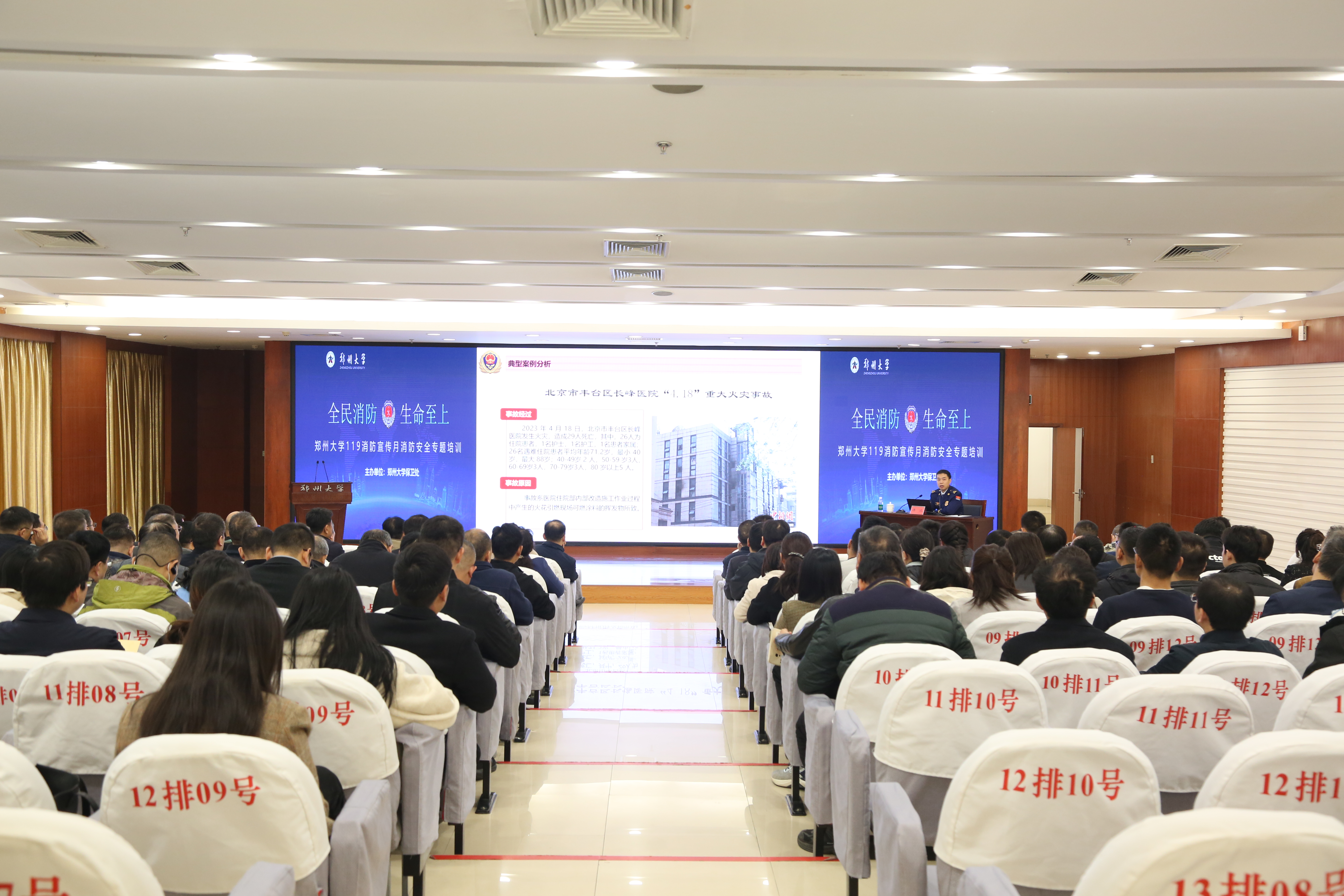 11月8日上午,由best365英国在线体育官网保卫处主办的119消防宣传月消防安全专题培训在主校区举行。校党委常委、副校长徐东升出席活动,校部机关、学院、科研机构、直附属单位相关负责同志参加活动。此次培训特邀郑州市消防救援支队防火监督处一级指挥员许冰授课。他围绕“全面落实消防安全主体责任,防范化解重大消防风险”主题,从火灾形势及典型案例、消防设施管理、常见火灾隐患及日常火灾防范等方面,深入系统阐释了消防应知应会及疏散逃生技能常识,并针对学校消防安全管理现状提出了宝贵意见建议。
