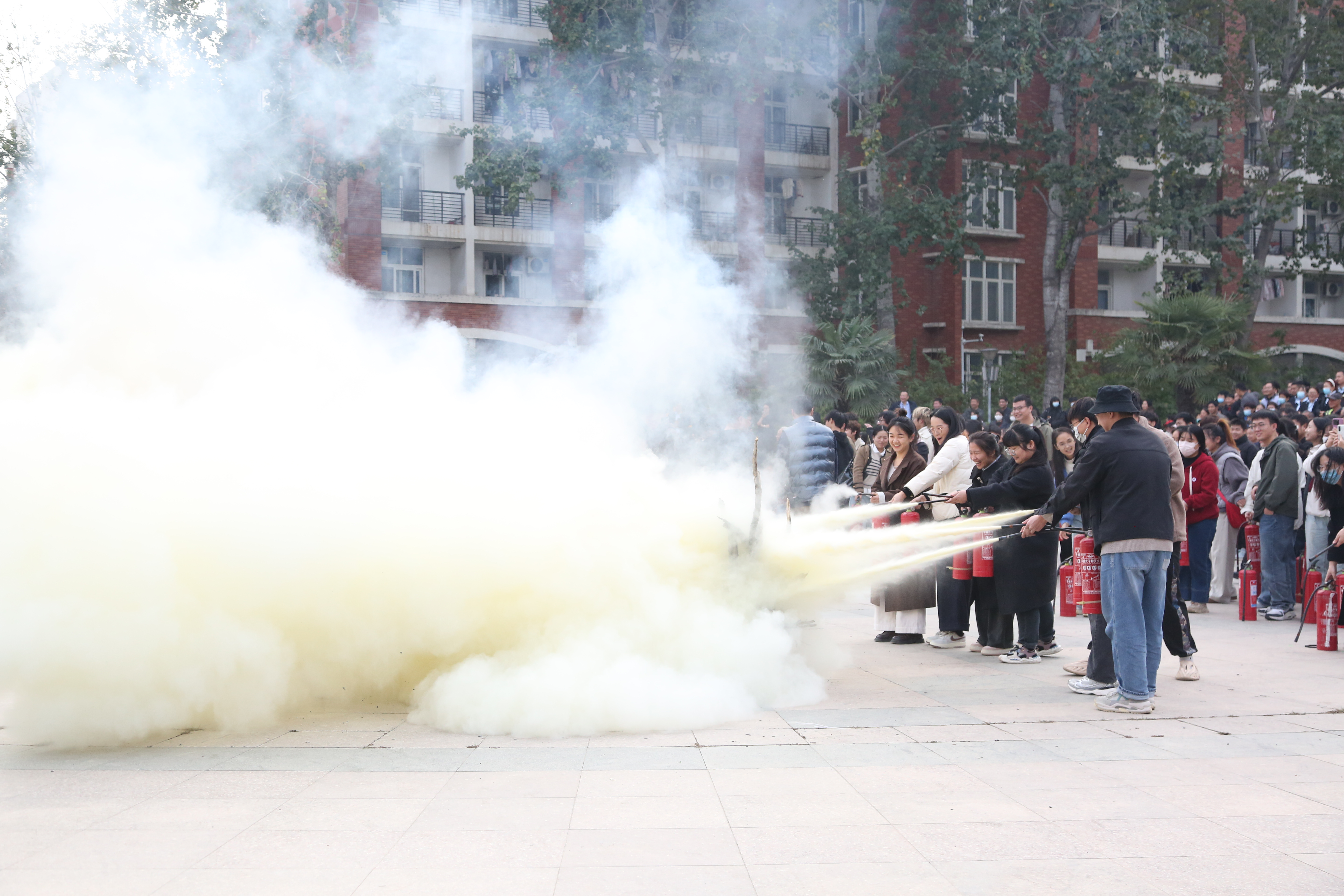 当日下午,学校保卫处组织450余名师生在主校区松园圆形广场开展消防逃生帐篷模拟体验及灭火实战演练活动。另外,在南校区、医学院校区保卫处还联合多部门同步开展了灭火器操作使用培训、现场实操灭火、逃生自救知识培训、应急疏散逃生演练等丰富多彩的宣传活动。