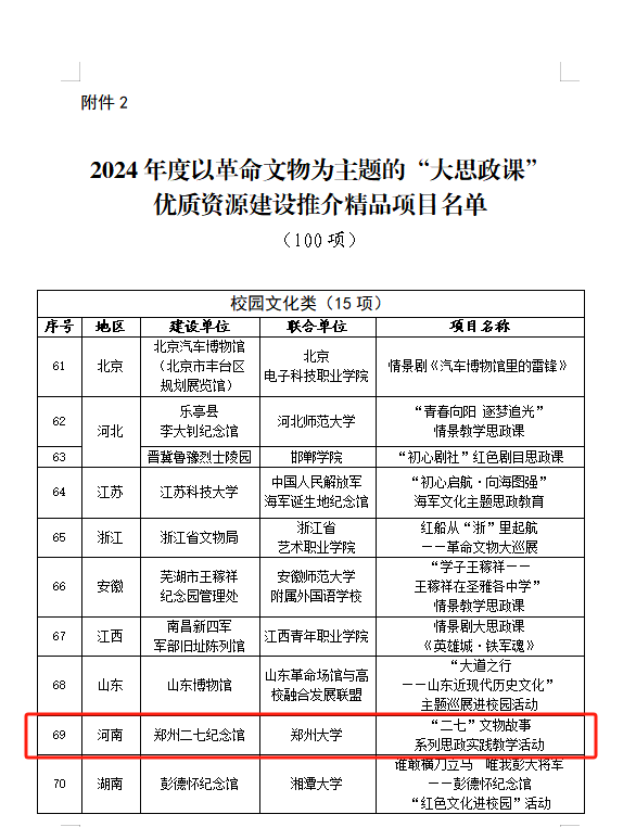 近日,国家文物局、教育部公布2024年度以革命文物为主题的“大思政课”优质资源建设项目名单,由best365英国在线体育官网联合郑州二七纪念馆申报的“‘二七’文物故事系列思政实践教学活动”获批精品项目。