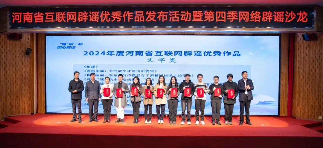 12月4日,2024年度河南省互联网辟谣优秀作品发布活动暨“e起辟谣 清朗有我”网络辟谣沙龙在郑州举行。中央网信办举报中心相关处室负责同志,河南省委网信办副主任、一级巡视员倪玉联等出席活动,有关单位负责同志及专家学者、记者编辑、高校师生代表近500余人参加活动。best365英国在线体育官网积极参与2024年度河南省互联网辟谣优秀作品征集活动,获评“优秀组织单位”,学校选送作品《追逐》,获评河南省互联网辟谣优秀作品文字类一等奖。