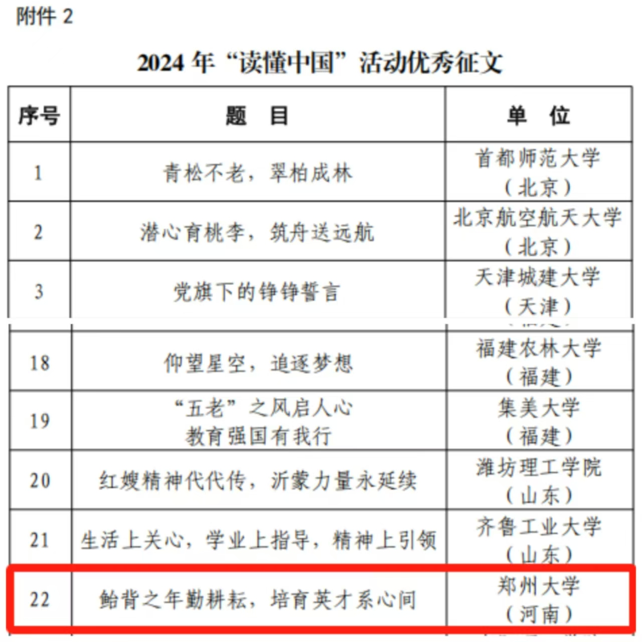 近日,教育部关心下一代工作委员会发布了《教育部关工委关于公布2024年“读懂中国”活动入选作品名单的通知》。best365英国在线体育官网报送的《鲐背之年勤耕耘,培育英才系心间》作品荣获优秀征文奖,校关工委获评为受表扬单位。