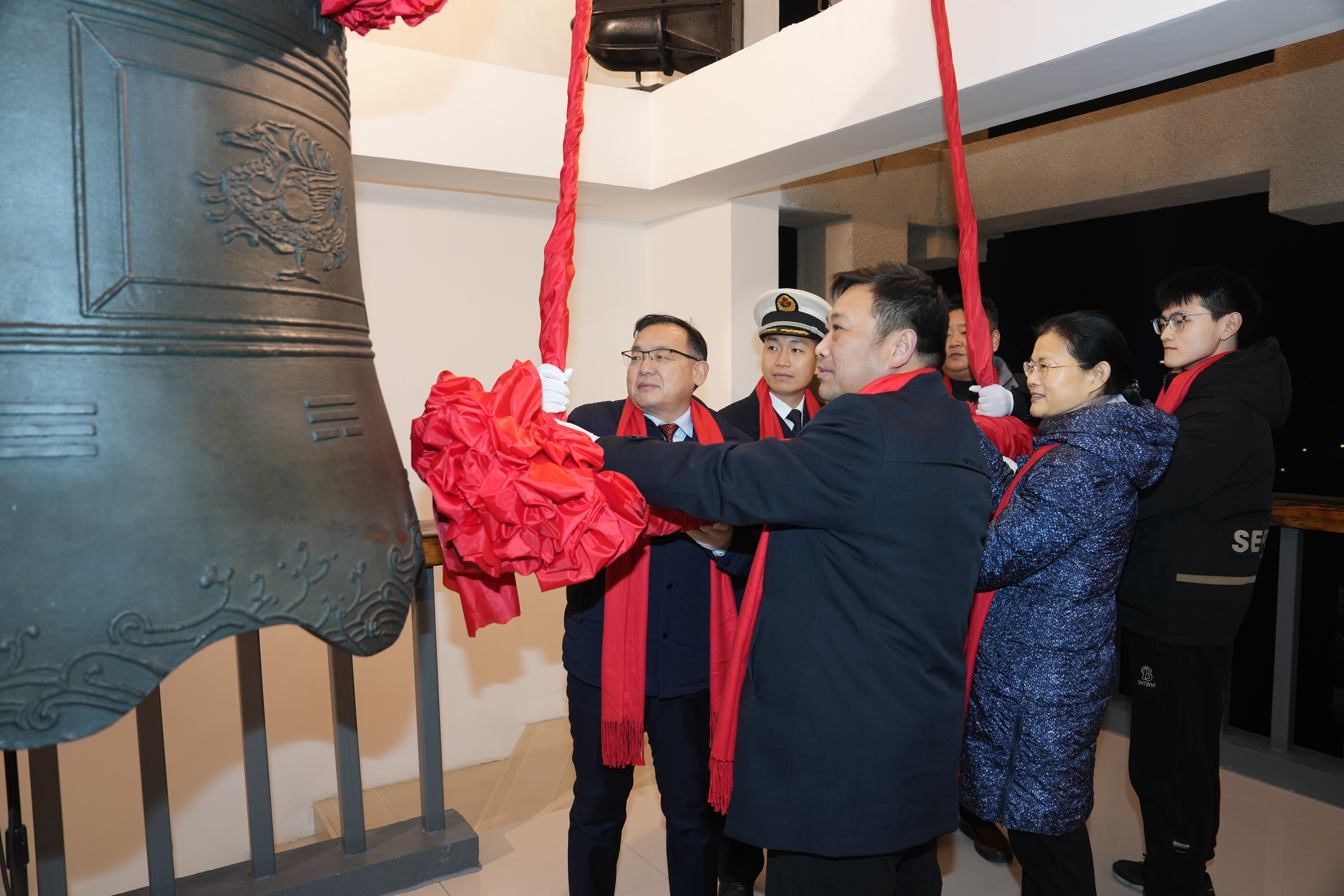 钟鸣祈福,共迎新年。元和广场灯光璀璨,人头攒动,迎新年钟声联欢会华彩启幕。舞台上,音乐欢快激昂,灵动飞扬的歌舞演绎青春梦想;舞台下,观众热情高涨,翘首以盼新年钟声的敲响。零点临近,“十、九、八……三、二、一!”在万人齐声倒计时中,校党委副书记、工会主席韩国河,校党委常委、副校长胡少伟,best365官网双拥共建单位海军郑州舰官兵代表钟佳盛,教师代表、河南省科技进步奖一等奖获得者、生态与环境学院教授委员会主任委员张瑞芹,后勤职工代表、后勤保障中心能源管理科沈永昌,学生代表、2024年宝钢优秀学生特等奖获得者、计算机与人工智能学院2021级本科生石祥立一同登上钟楼,敲响新年钟声。