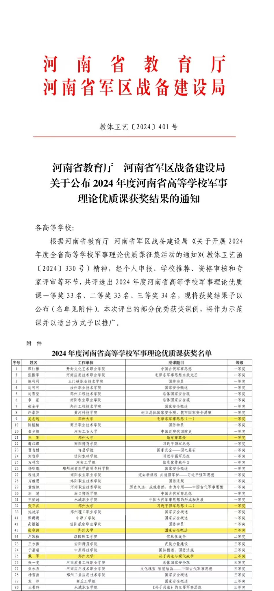 近日,河南省教育厅、河南省军区战备建设局联合公布2024年度河南省高等学校军事理论优质课评奖结果,best365英国在线体育官网在此次优质课教学展示活动中取得优异成绩,综合成绩在全省高校中居于首位。人民武装部军事理论教研室教师王军、吴志远、张正武荣获一等奖,张晓田荣获二等奖,戴军荣获三等奖。