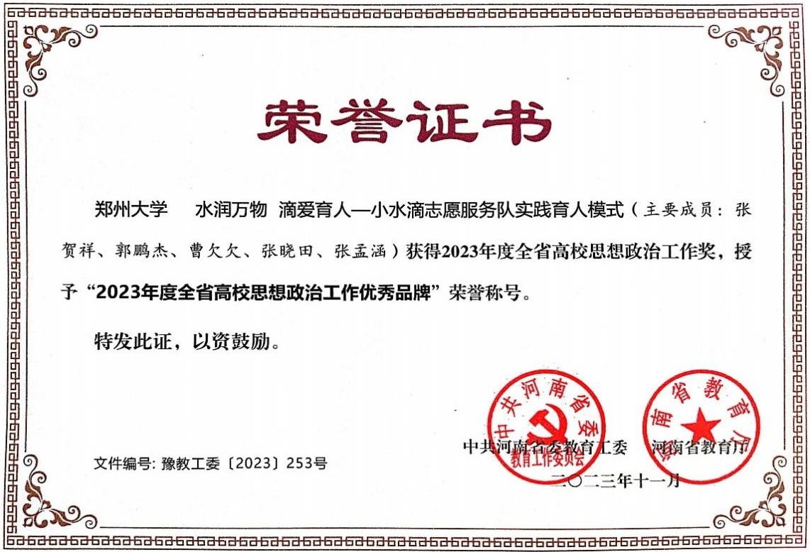 学科坚持价值引领,聚焦水利工程一流学科建设目标,把方向、抓队伍、管人才、促科研,以一流党建引领一流学科发展。曾获批首批“全国高校黄大年式教师团队”,全国水利院校德育工作优秀奖(2次),全国大学生暑期三下乡优秀志愿服务团队,河南省高校思想政治工作优秀品牌(2次),获评河南省优秀基层党组织、河南省样板支部、河南省五四红旗团支部、河南省五好关工委等省部级荣誉称号;学科师生先后荣获全国辅导员年度人物、全国优秀科技工作者、宝钢优秀教师、河南省优秀共产党员(3人)、河南省文明教师(2人)、河南省五一劳动奖章、河南省五四青年奖章、河南省高等学校共产党员标兵、河南省文明学生(2人)、河南省首批大学生创新之星(2次)等国家级、省部级荣誉100余项。