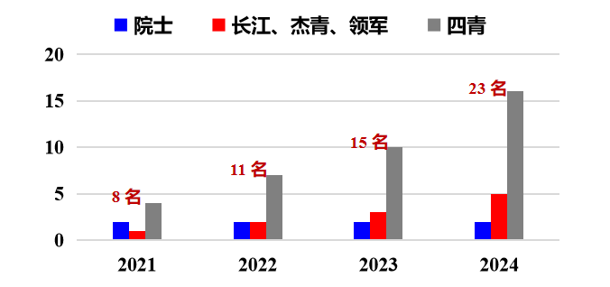 自2021年以来,国家级高层次人才从10人次快速增长至28人次(2024),其中学科自主培养国家“四青”人才7人。此外,1人荣获2023年度亚太物理学会等离子体物理大会青年科学家奖、2024年度国际纯粹与应用物理联合会超强激光青年科学家奖,3人入选“科睿唯安”2024年度全球高被引科学家榜单。