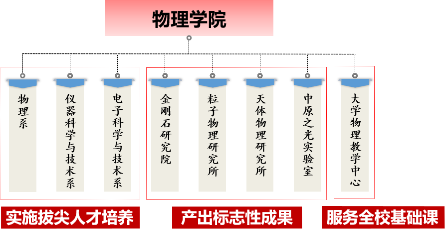 以学科为导向,形成了3系1院2所1室1中心的研究型组织架构。下辖物理系、仪器科学与技术系、电子科学与技术系、金刚石研究院、粒子物理研究所、天体物理研究所、大学物理教学中心等机构。拥有材料物理教育部重点实验、教育部集成电路设计与应用国际合作联合实验室、物理学国家级实验教学示范中心、低维量子物理与量子功能材料教育部创新团队、河南省金刚石光电材料与器件重点实验室、河南省先进光电材料与器件重点实验室、河南省量子功能材料国际联合实验室、河南省光电信息探测及应用工程研究中心、河南省智能视觉感知工程技术研究中心、河南省无损检测工程技术研究中心共10个优势平台资源。