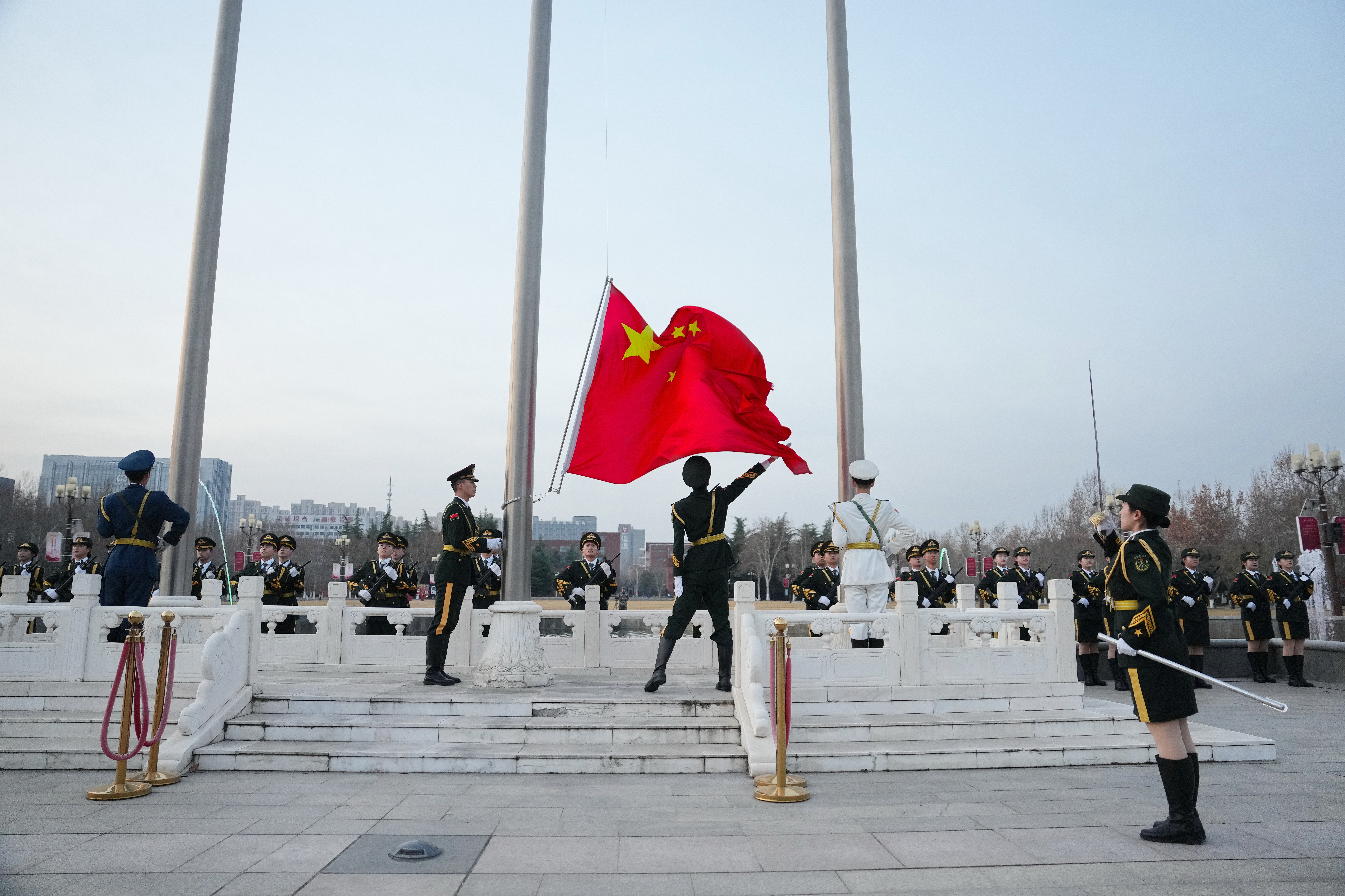 清晨,主校区五星广场师生代表列队肃立。7时整,升国旗仪式正式开始。国旗护卫队迈着铿锵有力的步伐,护送国旗走向升旗台。伴随着雄壮的国歌,鲜艳的五星红旗冉冉升起,全场师生高唱国歌、行注目礼,心中激荡起浓浓爱国之情。