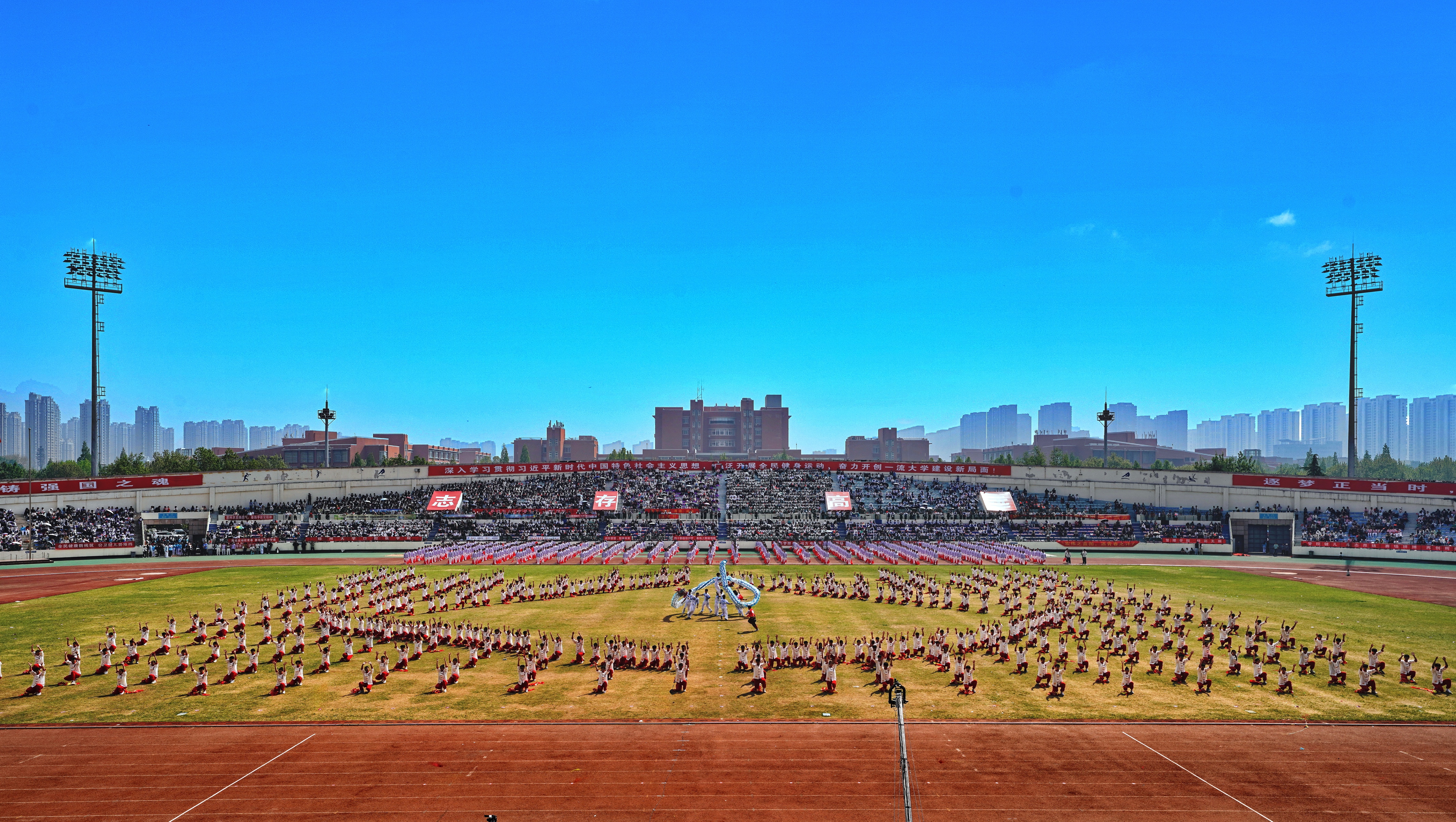 大型开幕式展演拉开帷幕。天空中,河南跳伞队10名队员如雄鹰展翅依次登场,第一组携国旗、校旗凌空招展,第二组拉着彩烟化作“七彩祥云”,第三组身着古装和20米长绸翩然飘落,以震撼方式为展演开场。展演分三个篇章展开。第一篇章《青春跃动・向阳而生》中,1100名操舞运动选修课学生带来团体操“同在红旗下”,以舒展的肢体语言和整齐的动作,诠释着新时代大学生对健康体魄的追求与青春宣言。第二篇章《龙舞千寻・薪火相传》由体育学院近500名学生演绎“龙之舞”,将非物质文化遗产的魅力展现得淋漓尽致,寄寓着“承袭文化之魂,舞出时代新声”的美好愿景。第三篇章《师韵芳华・岁月如歌》中,来自50多个基层工会的800余名女教职工以“时尚养生操”展现师韵芳华,在刚柔并济间将时尚与康养理念巧妙融合,彰显为建设中国特色世界一流大学目标拼搏的巾帼豪情。