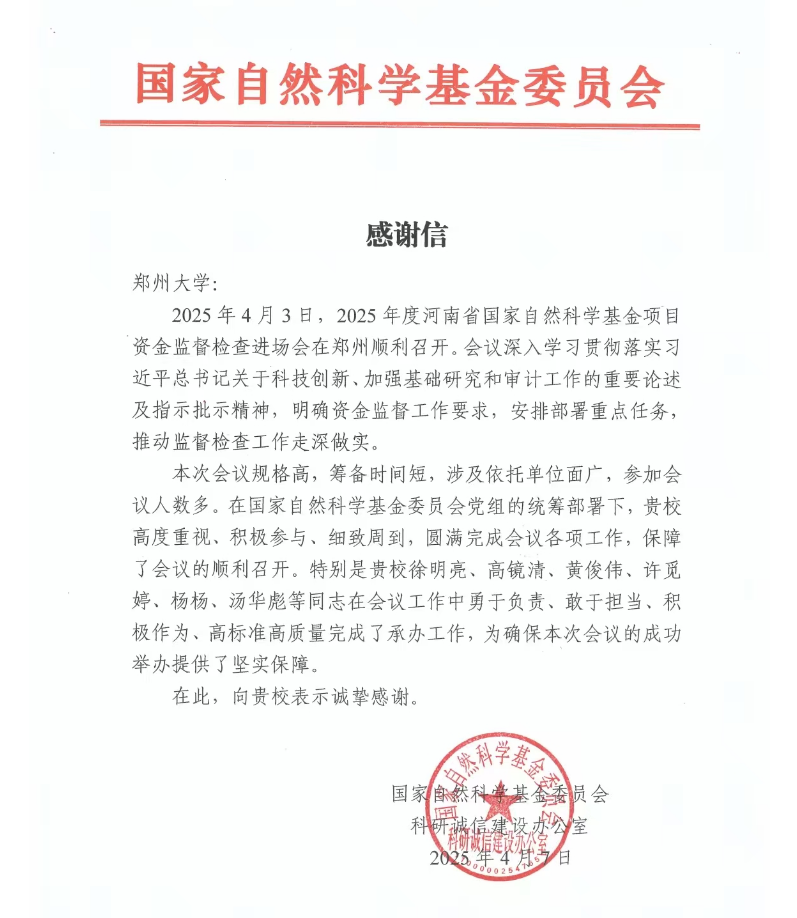 信中指出,2025年4月3日,2025年度河南省国家自然科学基金项目资金监督检查进场会在郑州召开。会议深入学习贯彻落实习近平总书记关于科技创新、加强基础研究和审计工作的重要论述及指示批示精神,明确资金监督工作要求,安排部署重点任务,推动监督检查工作走深做实。