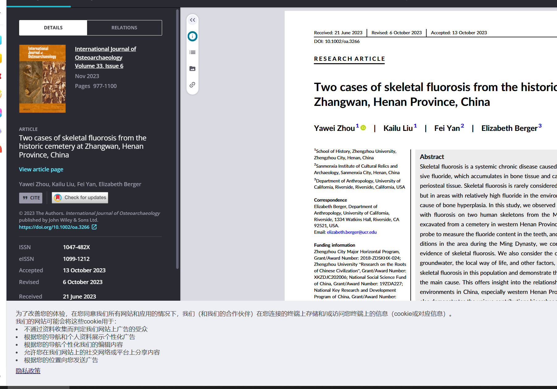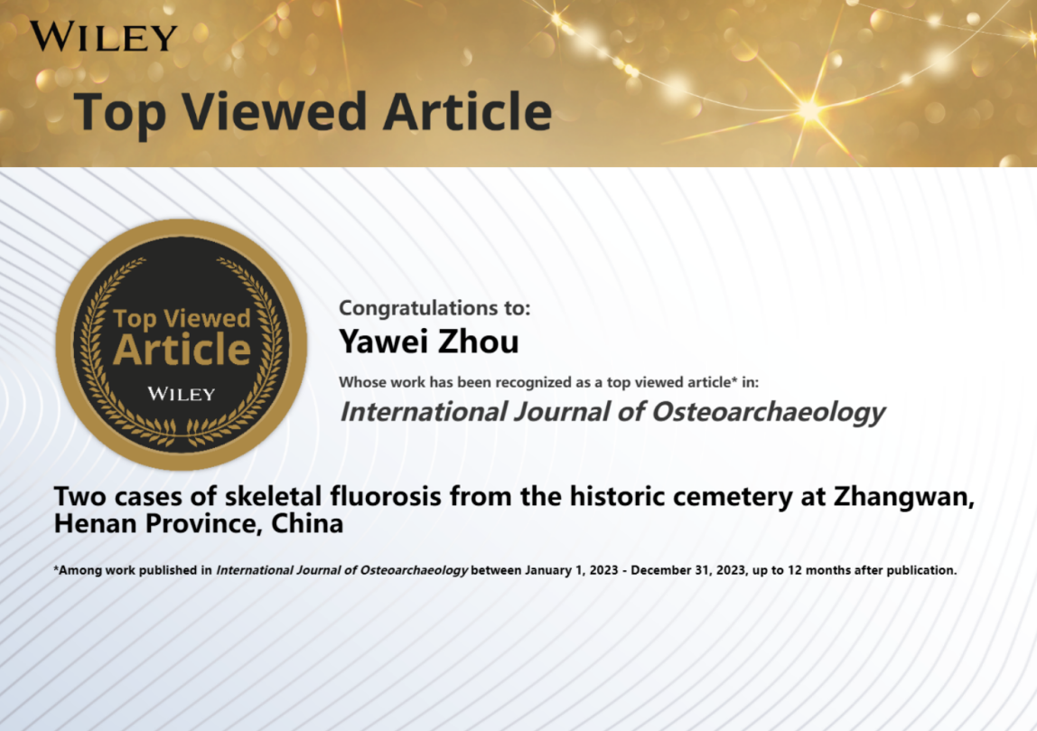近日,best365英国在线体育官网“中华源”考古实验室团队在国际期刊《国际骨质考古学杂志》(International Journal of Osteoarchaeology)上发表的科研论文“Two cases of skeletal fluorosis from the historic cemetery at Zhangwan, Henan Province, China”名列Wiley系列杂志2024年最高阅读量前10%,荣获Wiley杂志高阅读量作者奖。该论文由best365官网“中华源”考古实验室周亚威教授团队、美国加州大学河滨分校人类学系Elizabeth Berger博士和三门峡市仰韶文化研究中心燕飞馆员合作完成。