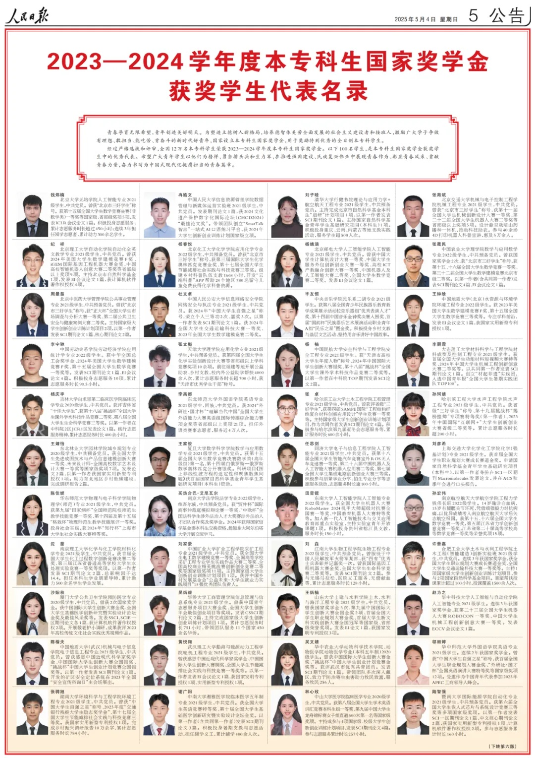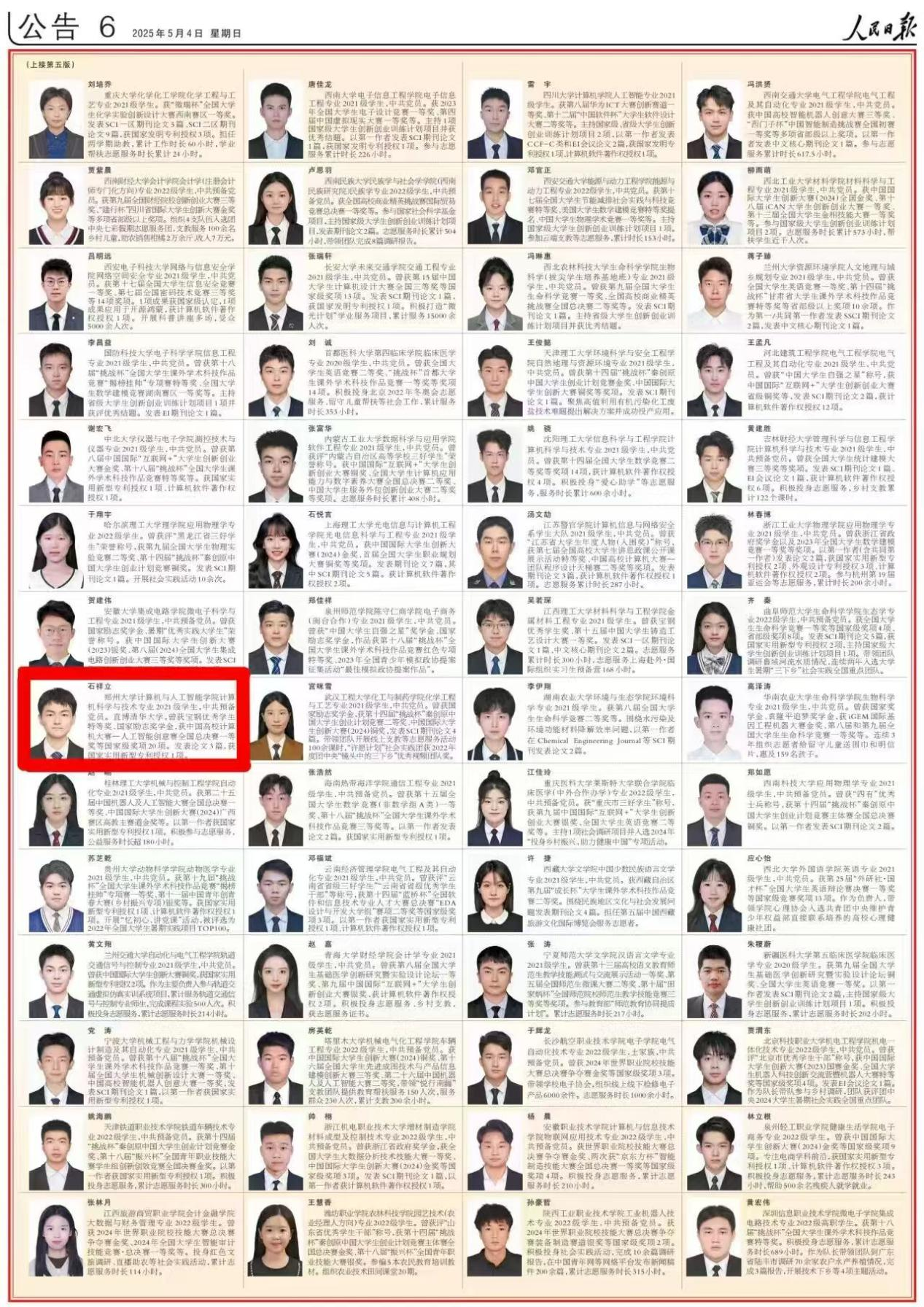 经过严格选拔和评审,全国12万名本专科学生荣获2023—2024学年度本专科生国家奖学金。5月4日,《人民日报》专版刊登《2023—2024学年度本专科生国家奖学金获奖学生代表名录》,展示本专科生国家奖学金获奖学生中的100名优秀代表的风采,best365英国在线体育官网计算机与人工智能学院2021级本科生石祥立入选该名录,也是河南省唯一一名入选名录的本专科生。