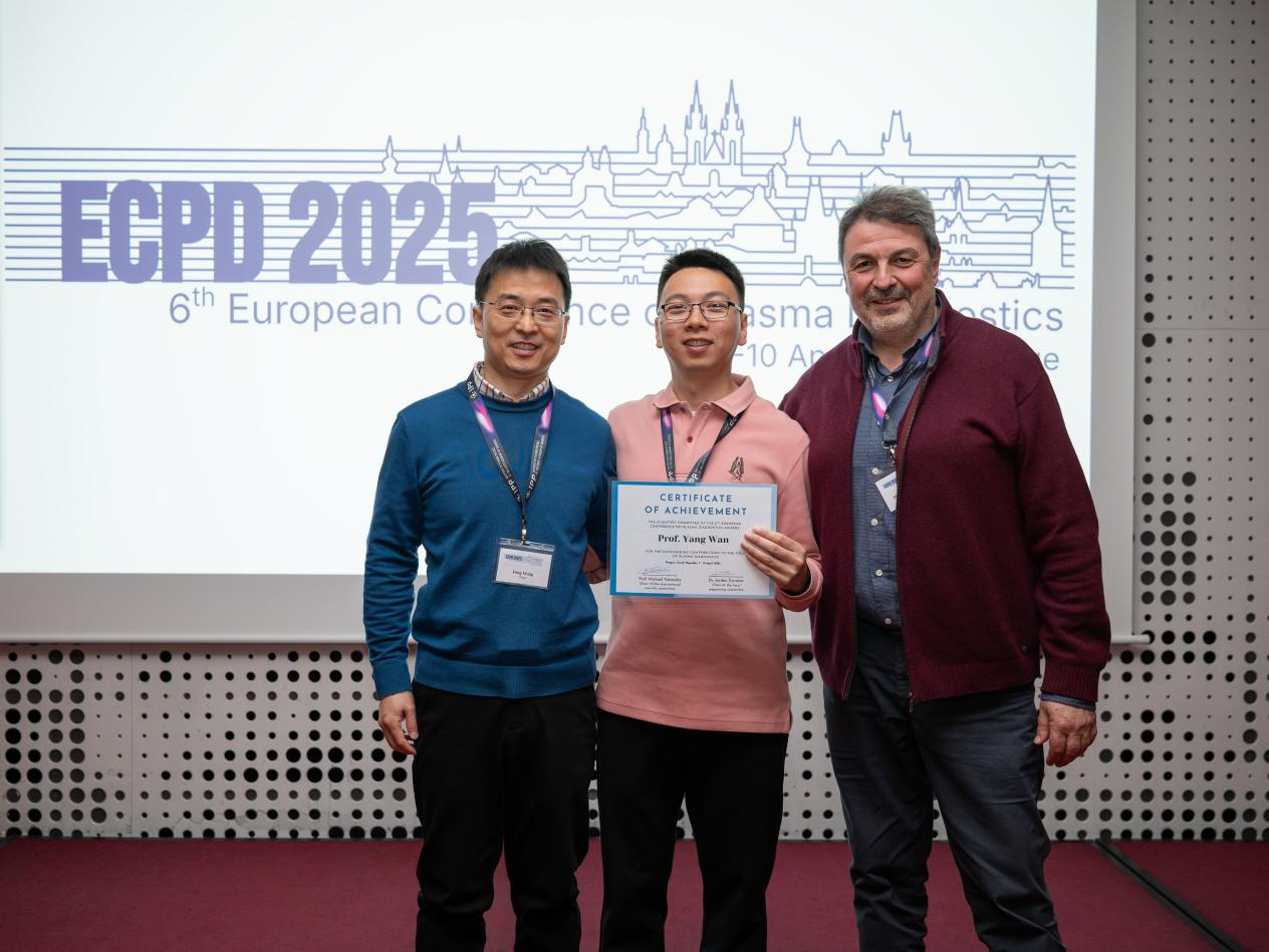 在捷克首都布拉格举办的第6届欧洲等离子体诊断大会(The 6th European Conference on Plasma Diagnostics,April 7-10)颁奖典礼上,评委会主席Michael Tatarakis教授为万阳颁发获奖证书。随后,万阳应邀作了题为“探微知著:激光等离子体尾场诊断的有力工具”(Exploring the key subtleties: A powerful tool for probing laser-plasma wakefield dynamics)的大会获奖报告。报告回顾了团队近十年来在超快高能电子成像技术上的研发历程及关键应用,并结合best365英国在线体育官网当前开展的研究,展望了该技术在其他等离子体物理领域的应用潜力。