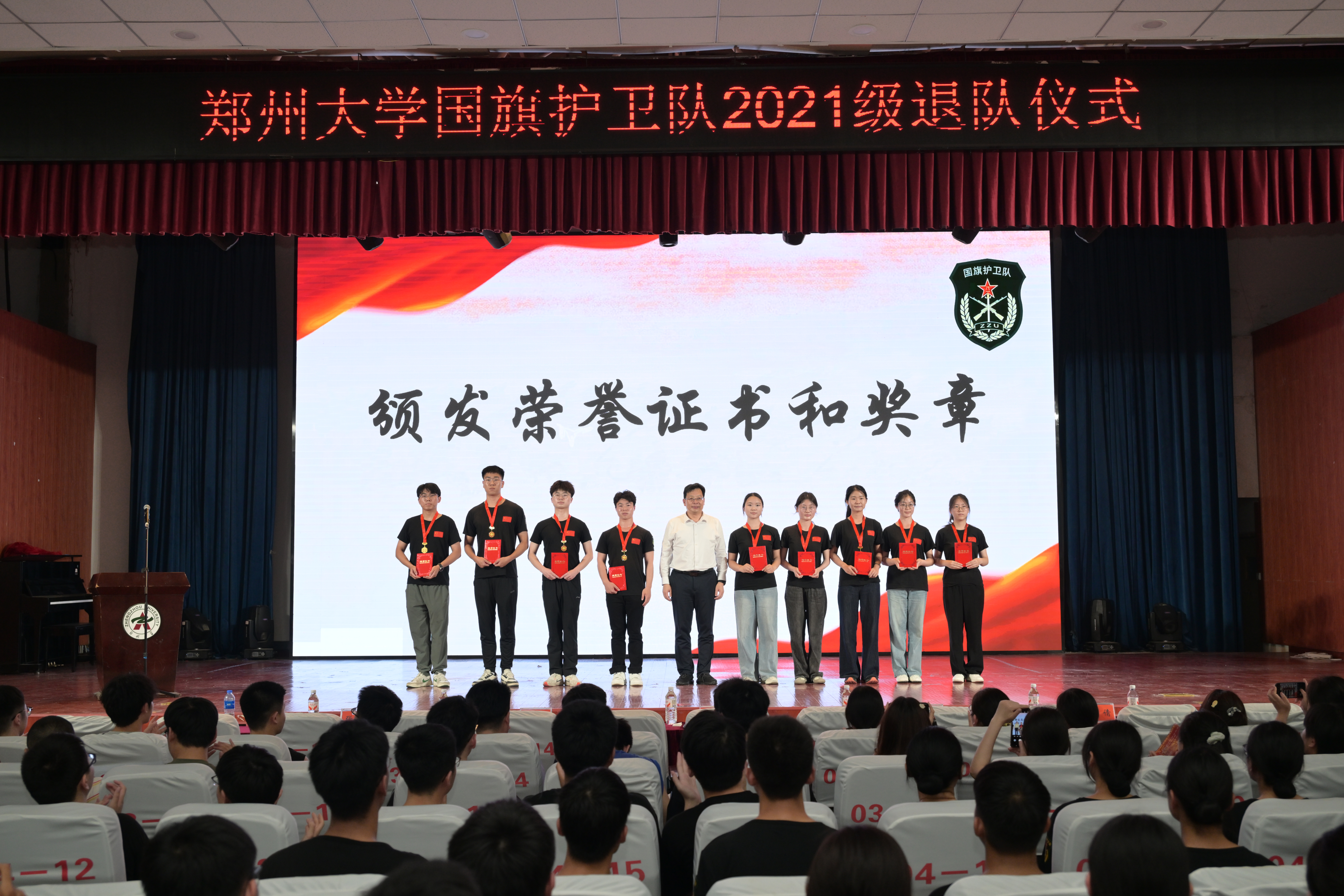 仪式在雄壮的国歌声中拉开序幕。大屏幕光影流转,一段纪实视频瞬间将全场拉入四载峥嵘岁月:晨光中浸透汗水的作训服、寒夜里紧握钢枪的冻僵双手、烈日下纹丝不动的挺拔军姿——每一帧都是对忠诚信仰的无声诠释,铭刻着这支铁血队伍的荣光征程!科目表演精彩纷呈:刚劲勇猛的军体拳、凌厉迅猛的擒敌拳、英姿飒爽的匕首操……,每一个动作都凝聚着日夜锤炼的汗水,展现了郑大学子的血性豪情与钢铁意志。现场不时爆发出热烈的掌声。