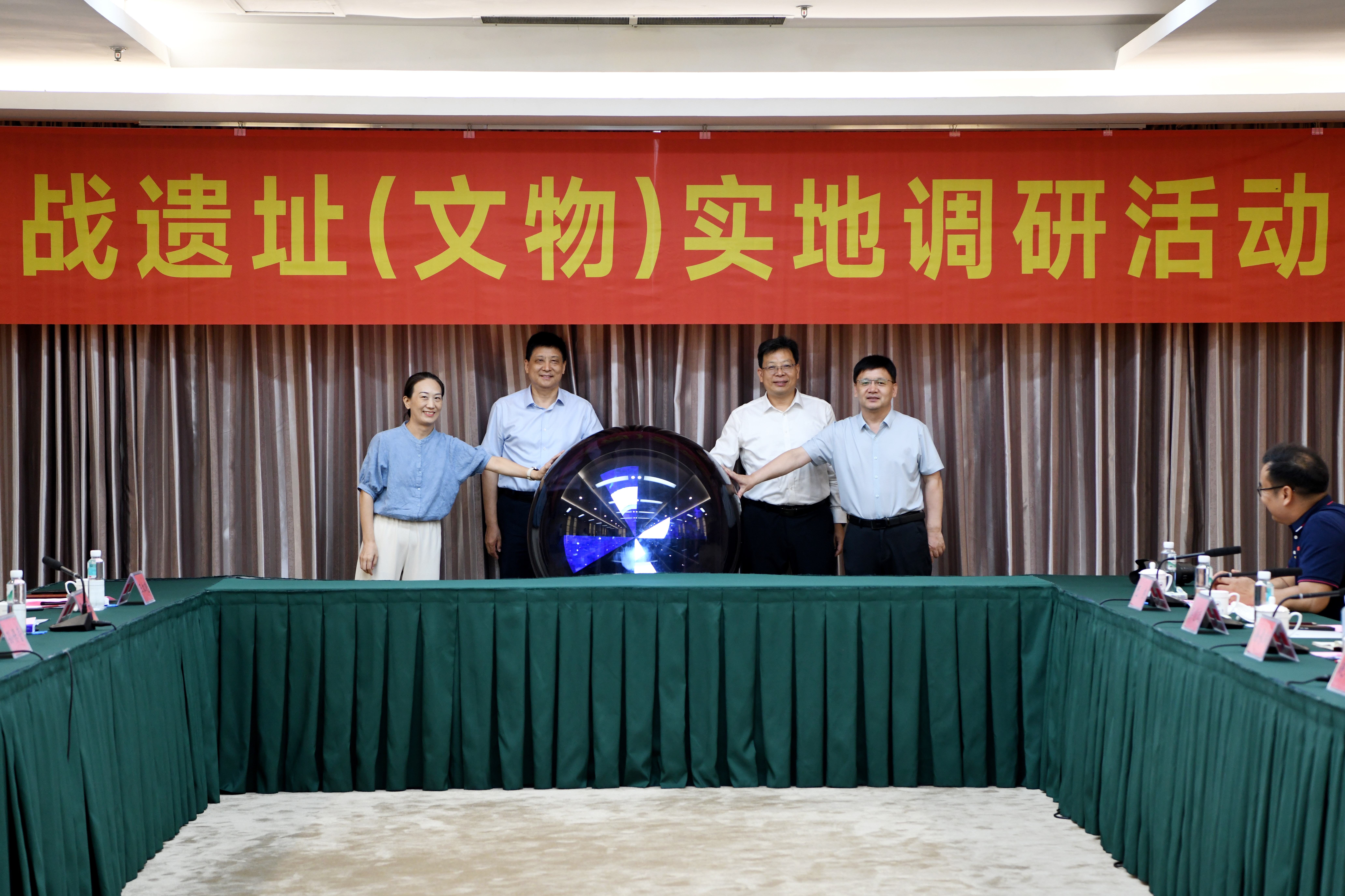 与会领导共同按下启动球,王利国向调研组授旗,标志着大别山抗战遗址(文物)实地调研活动正式启动。