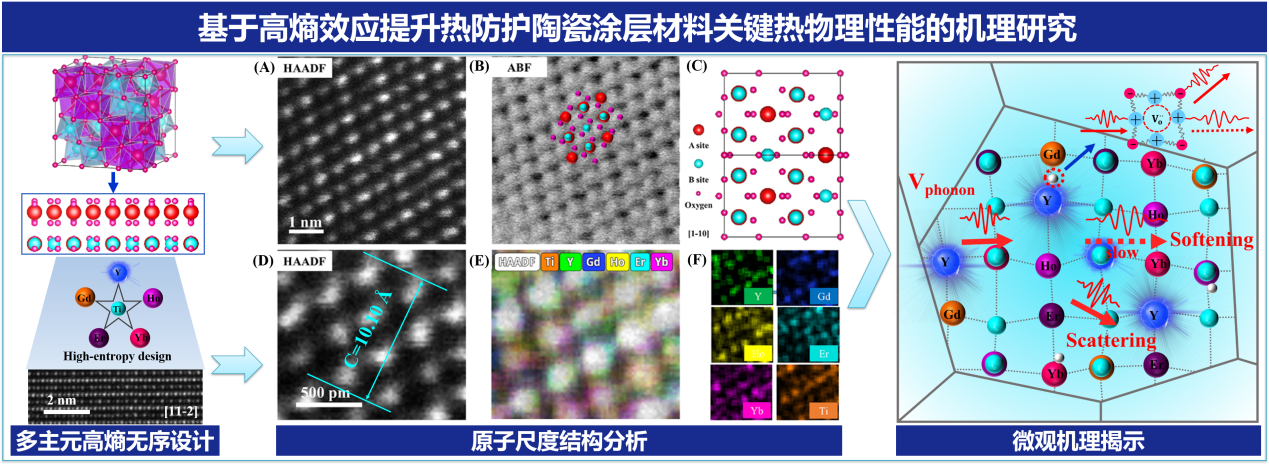 随着高温应用环境日益苛刻,传统涂层材料在进一步降低热导率和提升高温热稳定性方面面临巨大挑战,已成为天空飞行器装备热端部件表面防护涂层材料研发亟须突破的关键瓶颈。高熵效应赋予先进材料优异的热物理性能,使新型高熵陶瓷涂层在热防护领域展现出极大的应用潜力。best365官网先进陶瓷研究团队基于尺寸无序和质量无序的创新设计思路,成功研发出兼具低热导率与优异高温热稳定性的新型高熵稀土钛酸盐涂层材料,并率先在原子尺度揭示了高熵晶格畸变效应如何进一步降低热导率的深层机制,为极端环境用新型高温热防护涂层的研发开辟了新路径。相关成果于2023年以“High-entropy rare earth titanates with low thermal conductivity designed by lattice distortion”为题发表在Journal of the American Ceramic Society期刊,该工作引起了国内外同行的热切关注。