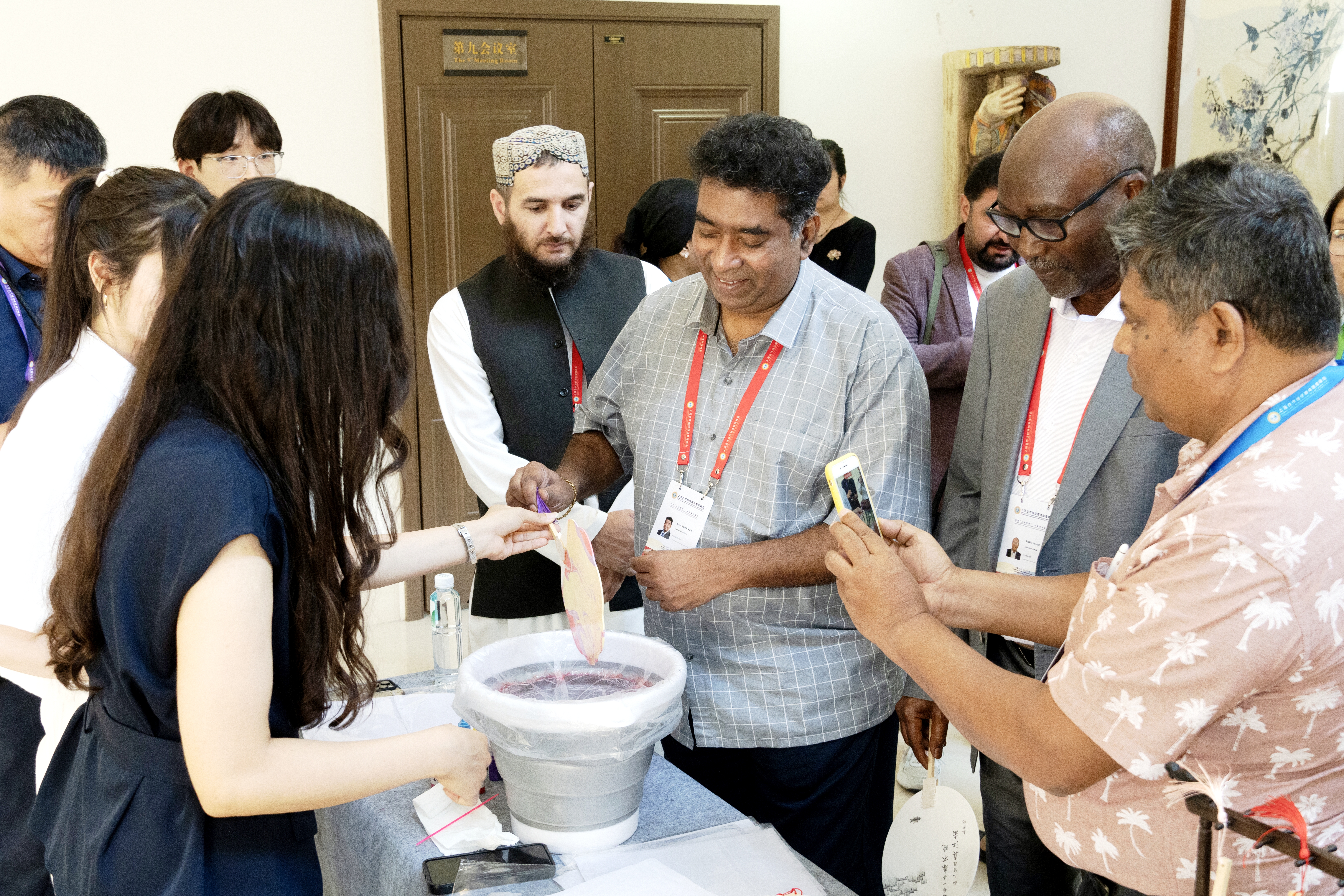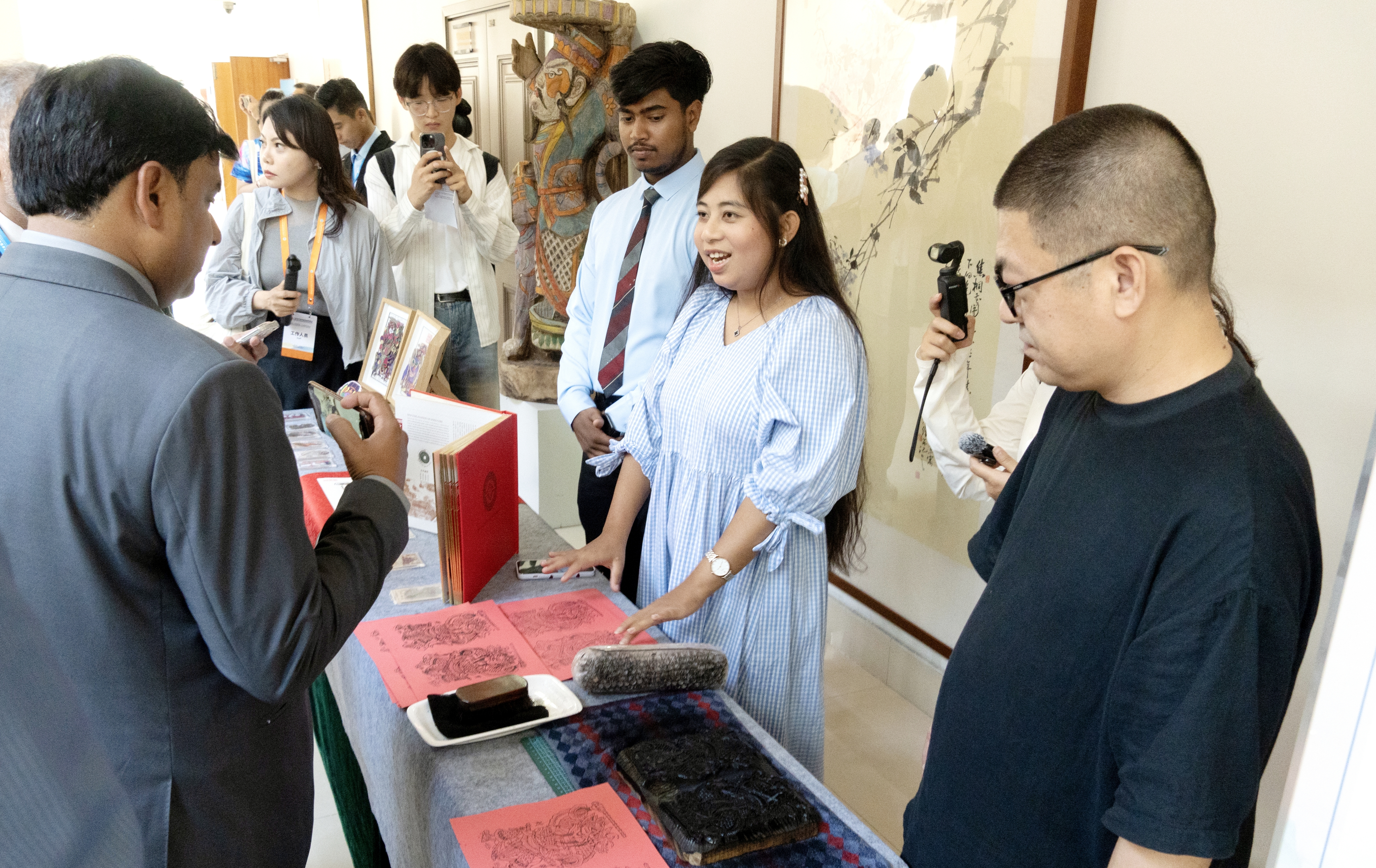 与会嘉宾体验书法、漆扇、拓印等非物质文化遗产活动