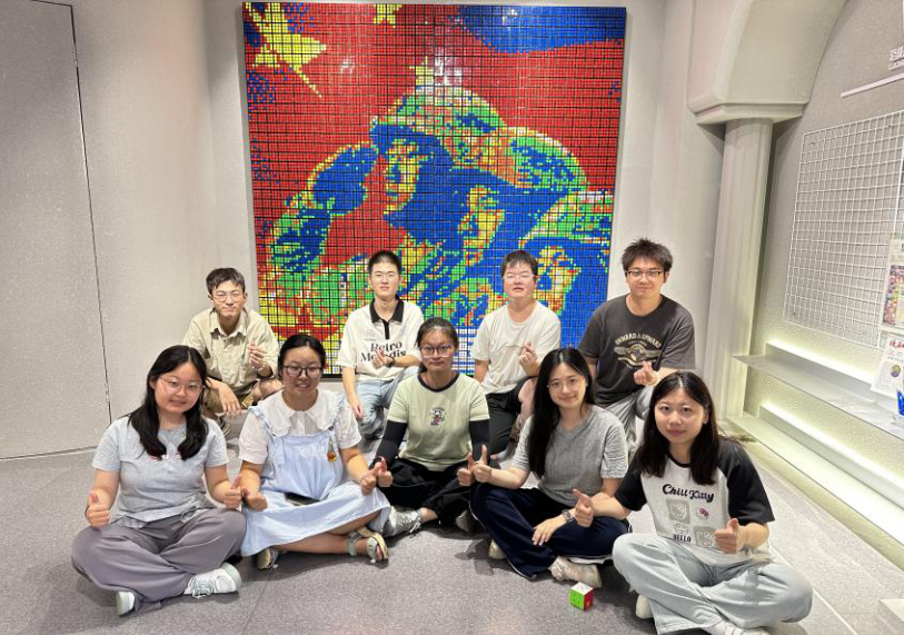 “红韵魔方梦之队”成员们与搭建的魔方墙合影