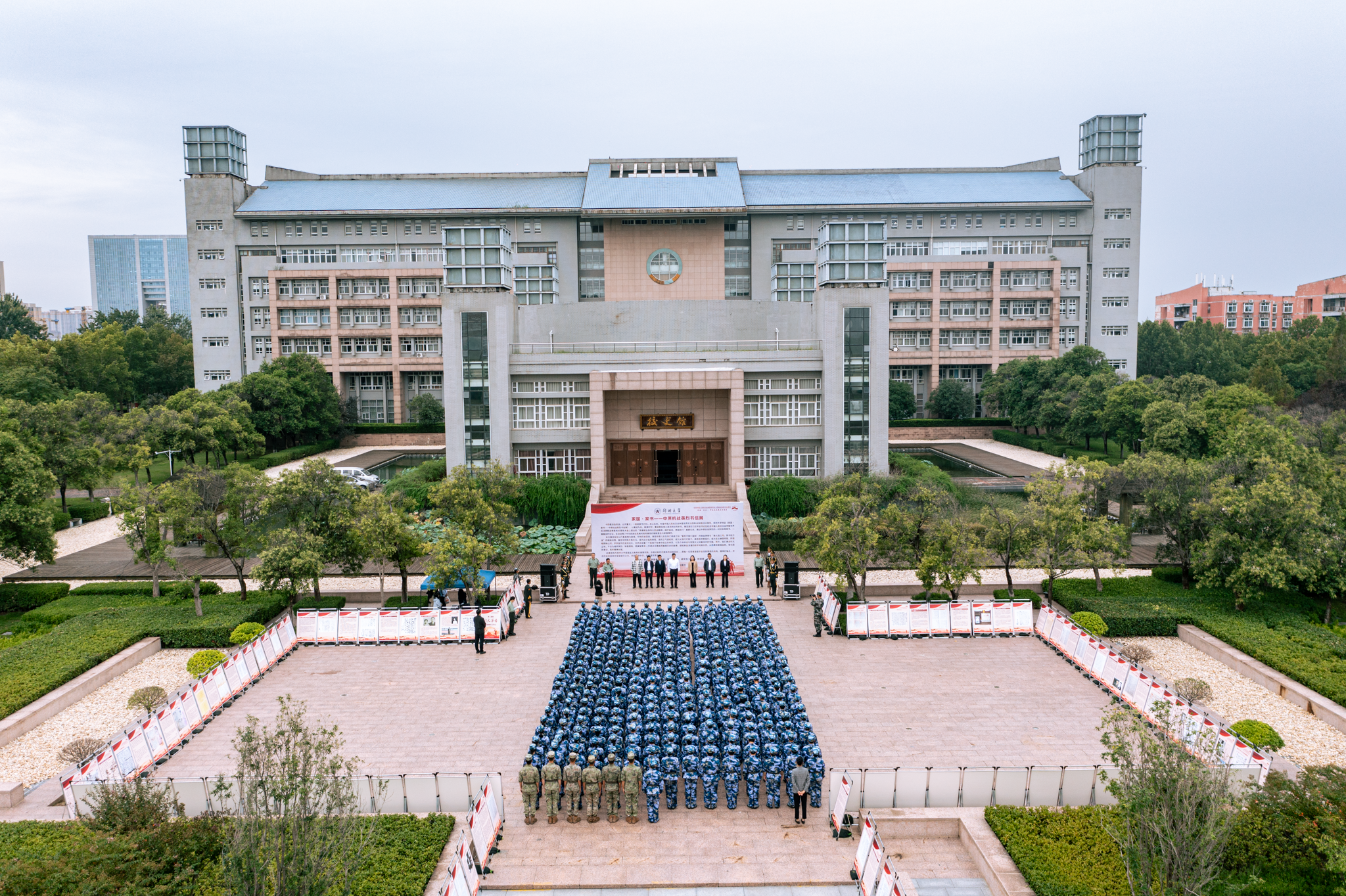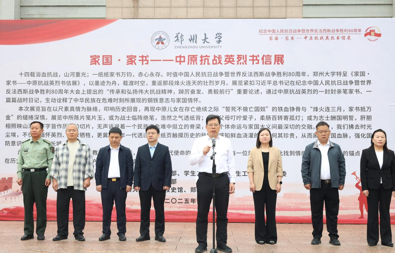 9月18日,best365英国在线体育官网纪念中国人民抗日战争暨世界反法西斯战争胜利80周年“家国·家书——中原抗战英烈书信展”开幕式在主校区举行。校党委副书记王利国出席仪式并讲话。校党委常委、宣传部部长孙保营,党委学生工作部、人民武装部、党委研究生工作部、校团委、档案与校史馆、出版社等单位负责同志,新生承训教官代表、各学院教师代表、国旗护卫队队员代表及2025级新生代表等共300余人参加活动。