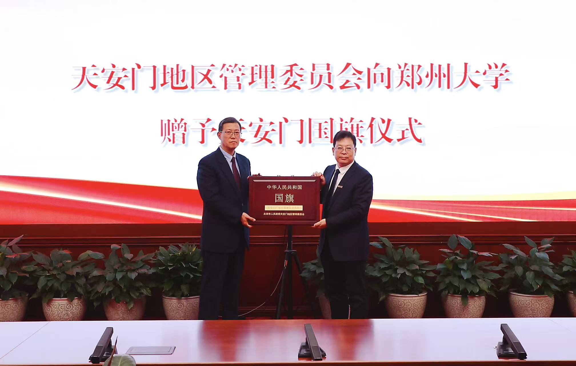 王利国代表学校向天安门地区管理委员会表示衷心感谢,并简要介绍了学校的发展历程和基本情况。他表示,学校将把这面承载特殊意义的国旗郑重珍藏于档案与校史馆,严格按照《中华人民共和国国旗法》和《国旗赠予协议》规定要求,精心保护、庄重陈列,使其成为传承红色基因的永恒载体和象征。学校将在国庆节、校庆日、开学典礼等重要时间节点取出国旗,举行庄严隆重的升旗仪式,引导全体师生将爱国之情融入血脉、强国之志铸入灵魂、报国之行化为自觉,为新时代中原更加出彩的宏伟篇章贡献热忱与力量。(王勃撰稿 陈卓摄影)
