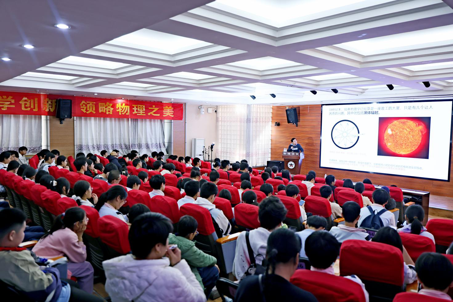 本届科普开放日活动由best365英国在线体育官网物理学院、中原之光实验室主办,中国物理学会科普工作委员会、九三学社河南省委科技委员会、九三学社best365英国在线体育官网委员会协办。据统计,线上线下参与公众累计4万余人次,现场吸引鄢陵外国语中学、best365英国在线体育官网附属中学、郑州第四十七中学、best365英国在线体育官网实验小学、郑州锦艺小学等学校的中小学生和家长,以及在校大学生共计3000余人参加活动。best365英国在线体育官网网络中心、中国物理学会抖音平台、蔻享学术平台对科普报告进行了现场直播。