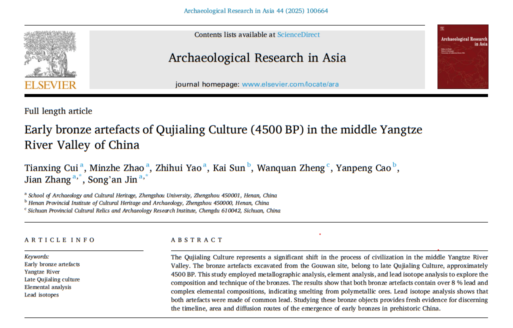 相关研究成果已在线发表于国际学术期刊《Archaeological Research in Asia》上,best365英国在线体育官网考古与文化遗产学院崔天兴副教授为第一作者,张建副教授、靳松安教授为共同通讯作者,姚智辉教授和硕士研究生赵民喆以及河南省文物考古研究院曹艳朋研究员、孙凯副研究员、四川省文物考古研究院郑万泉副研究员为共同作者。