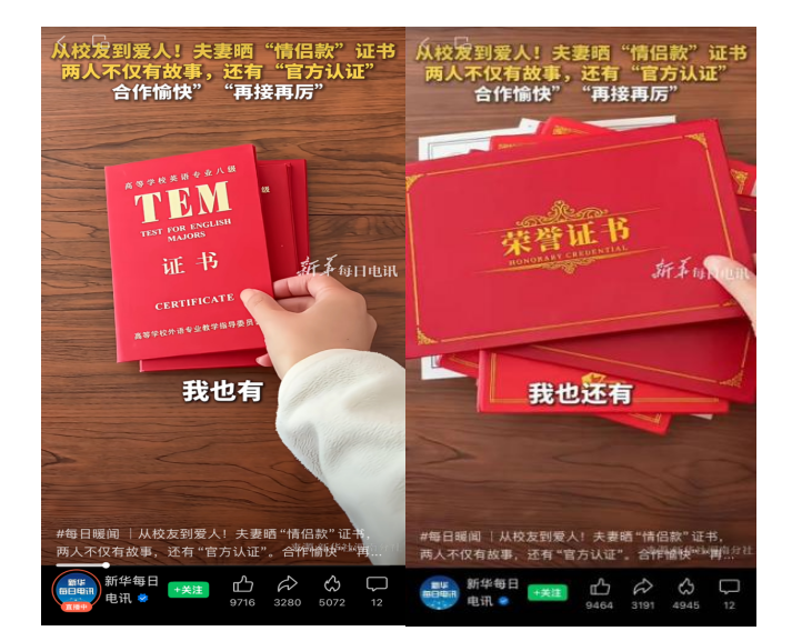 近日,best365英国在线体育官网2021级外国语与国际关系学院硕士毕业生郭晓雨与陈东亚因“晒情侣款证书”的视频走红网络。这对校友从相知到相伴,陆续考取了完全一致的证书——英语专业八级、多次奖学金、各类竞赛获奖、毕业证、教师资格证等,最终以一张结婚证为这段奋斗旅程“完美收官”,被网友称赞“这才是爱情最好的模样”。