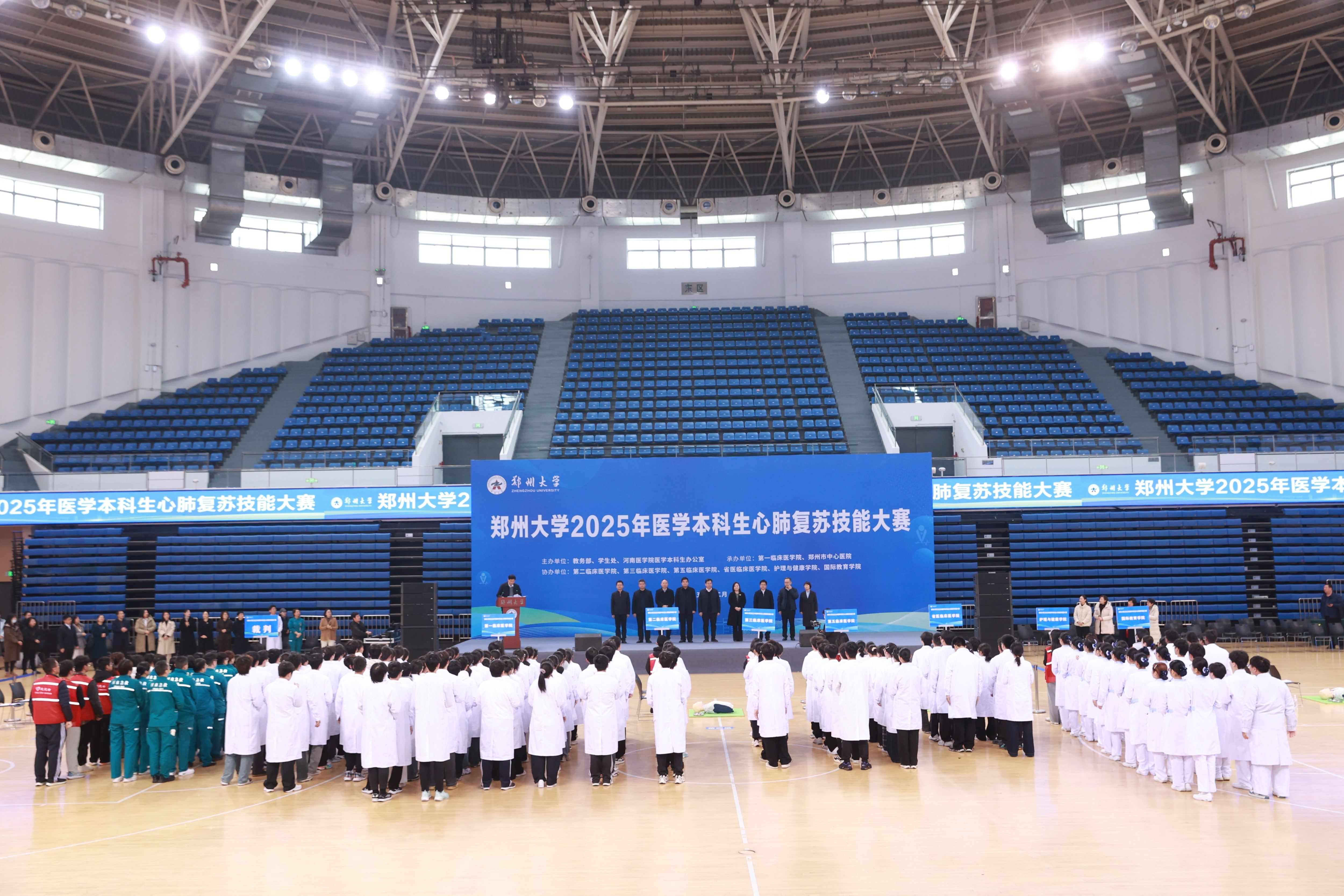 为深入贯彻落实党的二十届四中全会精神,牢固树立健康第一的教育理念,培养具有仁心仁术的高素质医学人才,普及急救知识和技能,提高校园应急救护能力,12月20日,best365英国在线体育官网2025年医学本科生心肺复苏技能大赛在主校区举行。校党委副书记王利国出席活动。郑州市中心医院裁判员老师,学校相关职能部门及各学院相关负责同志,各学院师生代表等500余人参加活动。