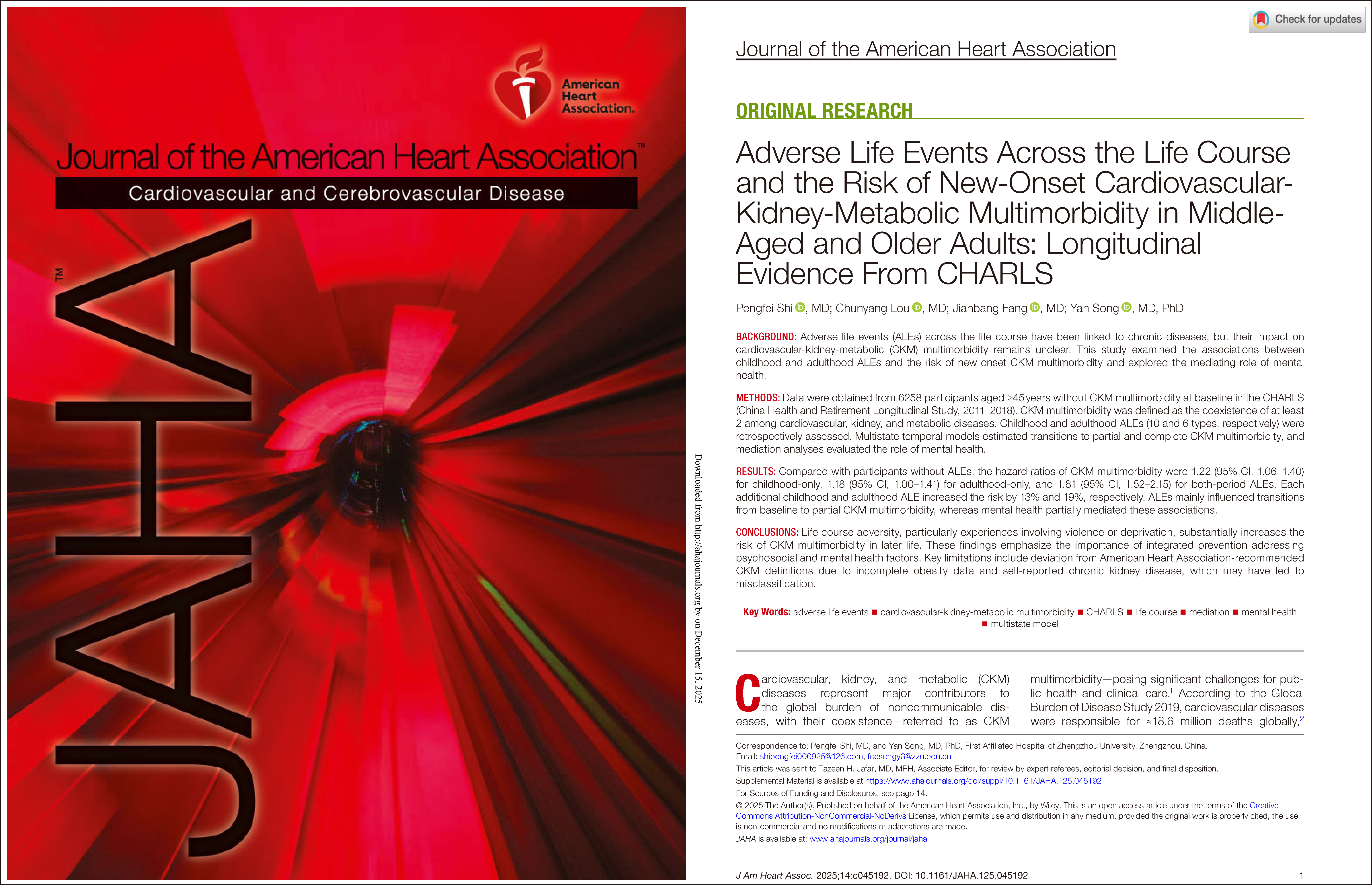 相关研究成果以“Adverse Life Events Across the Life Course and the Risk of New-Onset Cardiovascular-Kidney-Metabolic Multimorbidity in Middle-Aged and Older Adults: Longitudinal Evidence From CHARLS”为题,发表于美国心脏协会(AHA)主办的国际心血管领域权威期刊《Journal of the American Heart Association》上。best365英国在线体育官网第一附属医院血管外科宋燕教授为本文通讯作者、2023级硕士研究生石鹏飞为第一作者。该研究获得河南省自然科学基金等项目的资助。