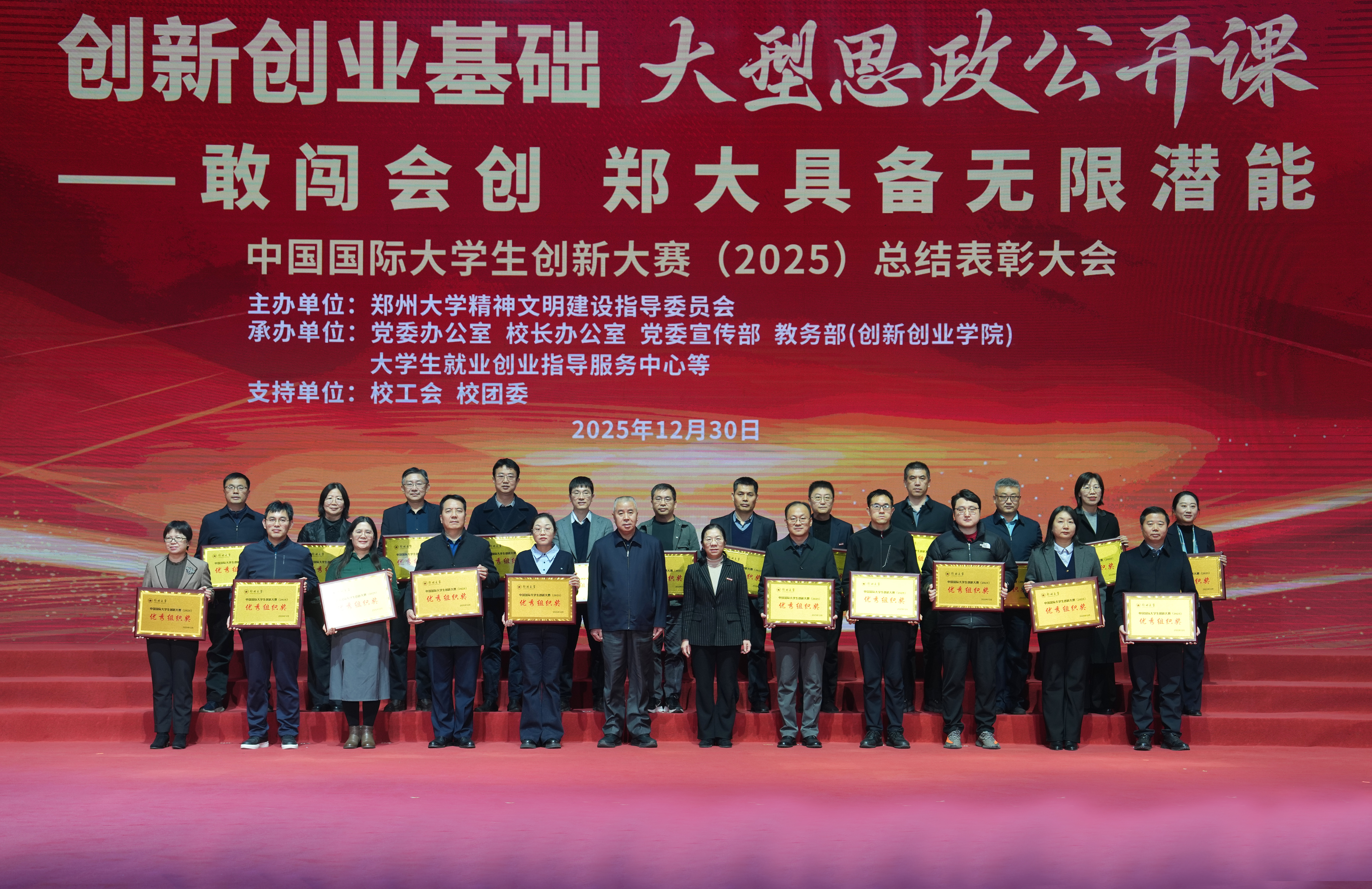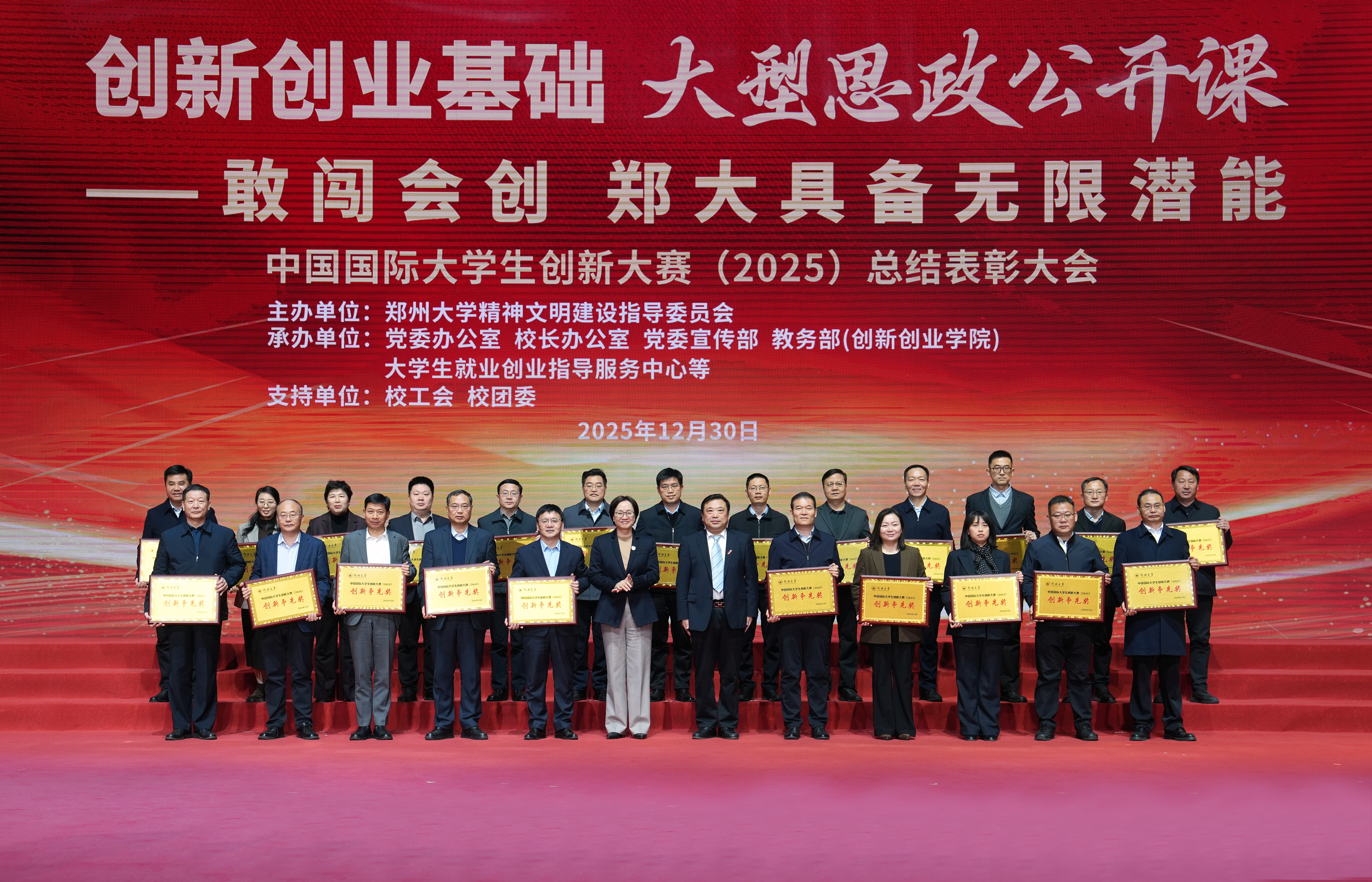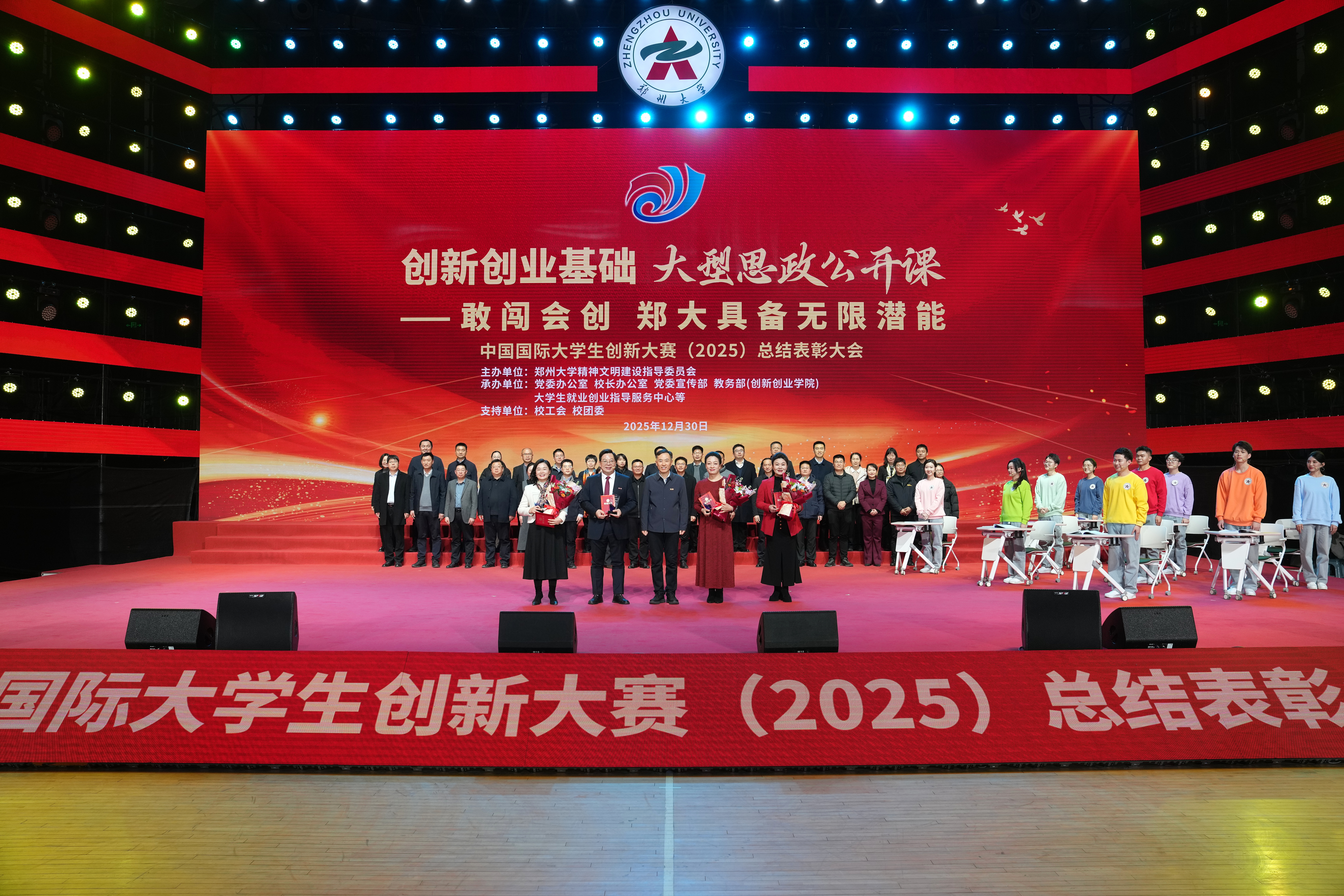 为深入落实立德树人根本任务,全面总结国创赛育人成果与办赛经验,表彰先进典型、凝聚奋进力量,并对2026年大赛进行动员部署,2025年12月30日晚,中国国际大学生创新大赛(2025)总结表彰大会暨“敢闯会创——郑大具备无限潜能”大型思政公开课在best365英国在线体育官网主校区中心体育馆举行。全体在校校领导,省教育厅、郑州市教育局有关部门负责同志出席,大赛各专项组成员、金奖项目师生代表、志愿者及师生代表约1000人现场参加,活动同步线上直播,打造了一堂气势恢宏、形式多样、内容丰富的思政“金课”。