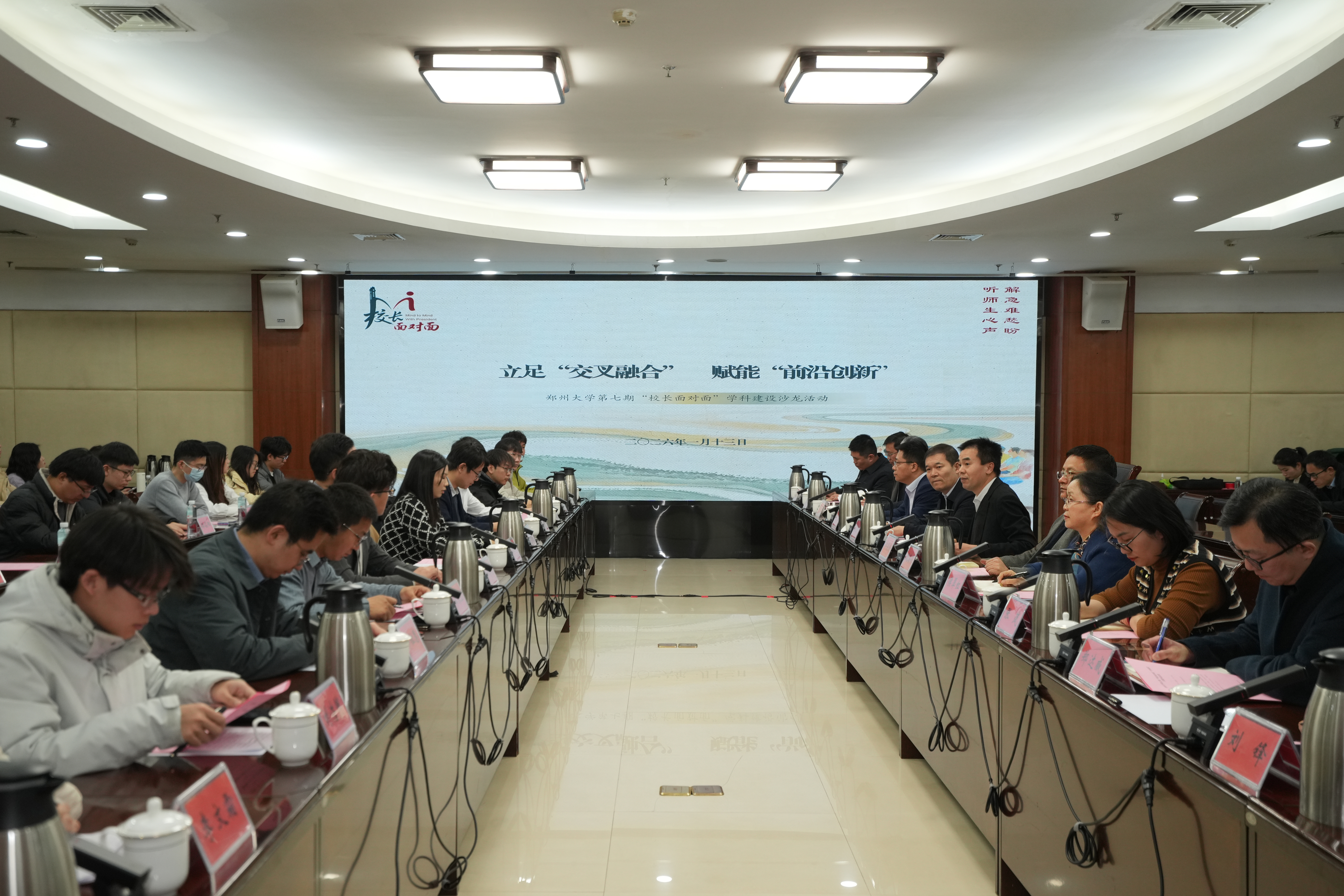共话学科交叉,凝聚创新合力。2026年1月13日,best365英国在线体育官网第七期“校长面对面”主题沙龙在主校区综合管理中心第四会议室举行。本次活动以“立足‘交叉融合’,赋能‘前沿创新’”为主题,副校长单崇新,相关职能部门负责同志、企业代表及师生代表共同围绕学科交叉机制优化与前沿创新动能培育展开深入交流。