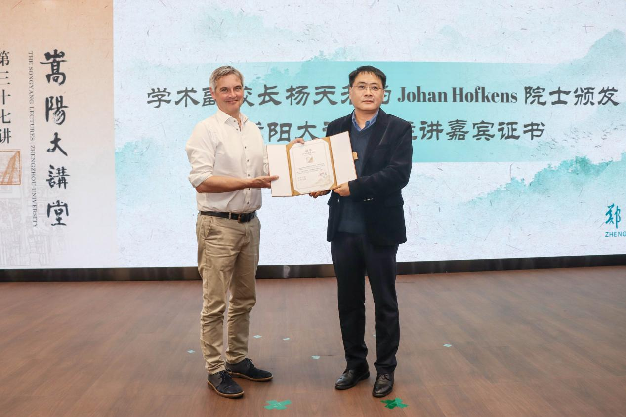 杨天若为Johan Hofkens颁发“嵩阳大讲堂”主讲嘉宾证书