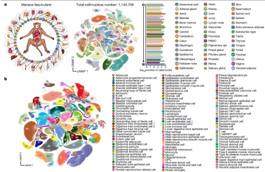 研究团队基于华大自主研发的单细胞建库和测序平台,对成年猕猴45个器官的约114万个细胞进行了单细胞测序分析,将其分成了113种主要细胞类型和463种细胞亚类,搭建了非人灵长类动物百万单细胞交互式资源网站。