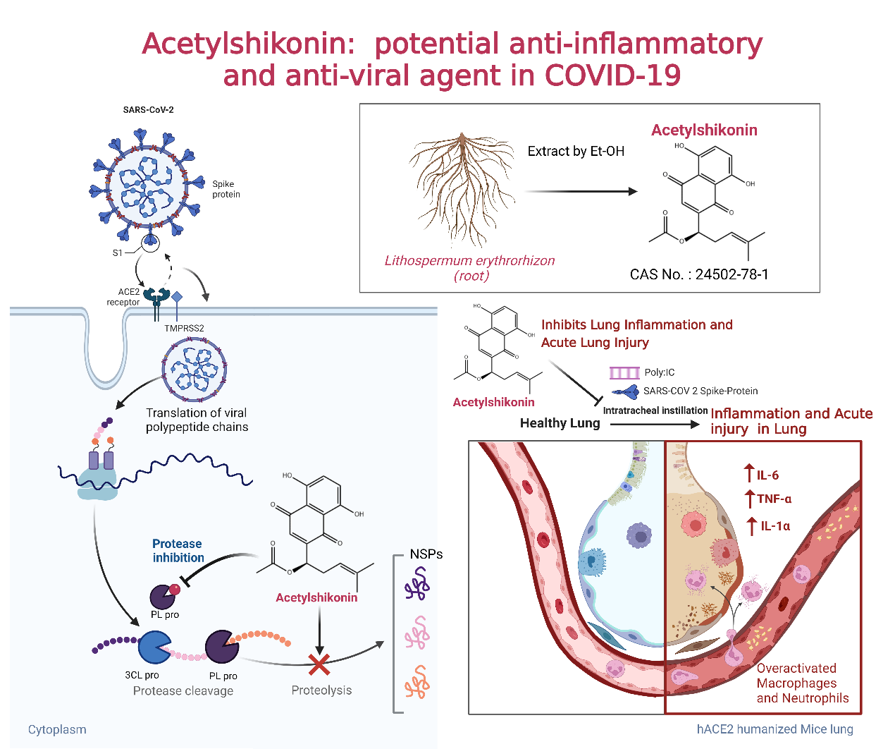 本研究发现的小分子抑制剂乙酰紫草素不但可以结合并抑制SARS-CoV-2 PL-pro的蛋白酶水解作用,同时能够拮抗干扰素通路,靶向PL-pro可以阻断病毒的生命周期,并增强机体的抗病毒信号,还具有显著的抗炎效果,可显著缓解由POLY:IC和重组病毒棘突蛋白所造成的急性肺损伤,针对新冠病毒引起的肺炎起到了标本兼治的作用。本研究为乙酰紫草素或其衍生物在新冠病毒肺炎治疗的应用奠定了良好基础。