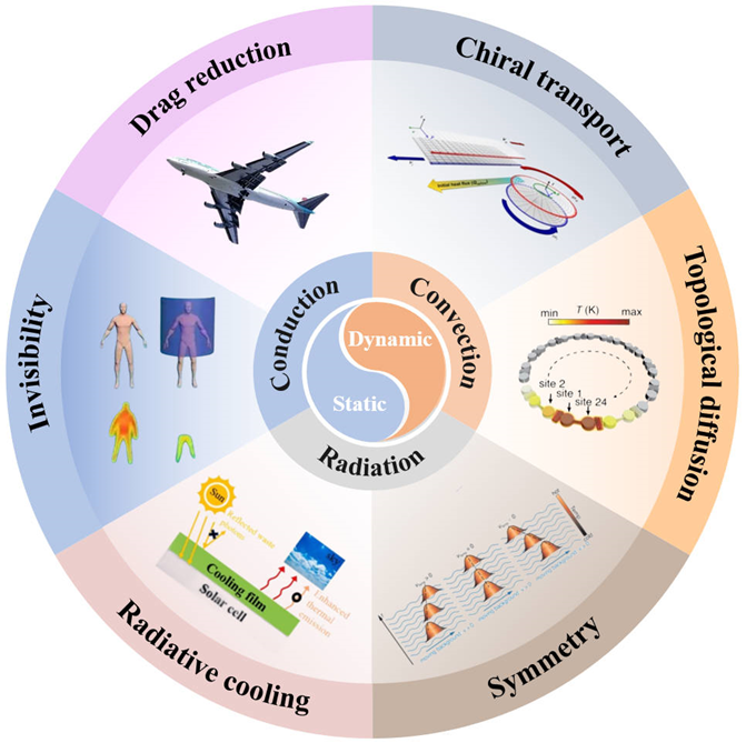 热学超材料由于其优异的特性,能够实现对热流的非常规调控。早期的热操纵研究主要基于热传递方程在空间坐标变换下的形式不变性。这种方法导致了各种稳态现象的发现,包括热隐身、热转换器、热集中器、热伪装等。该团队首次从动态和静态的视角,对包括传导、对流、辐射在内的多模调控理论进行了系统回顾,详细介绍了热管理技术在近场和远场热辐射中的应用,并探讨了热传导、热对流、热辐射相互耦合的多物理场热学超材料的发展。此外,本论文介绍了许多新的物理效应,包括拓扑传热,非互易扩散,非厄米物理,并对其未来的发展趋势进行了分析和展望。该研究工作对热学超材料在热管理相关领域的发展具有重要的引领和指导作用。
