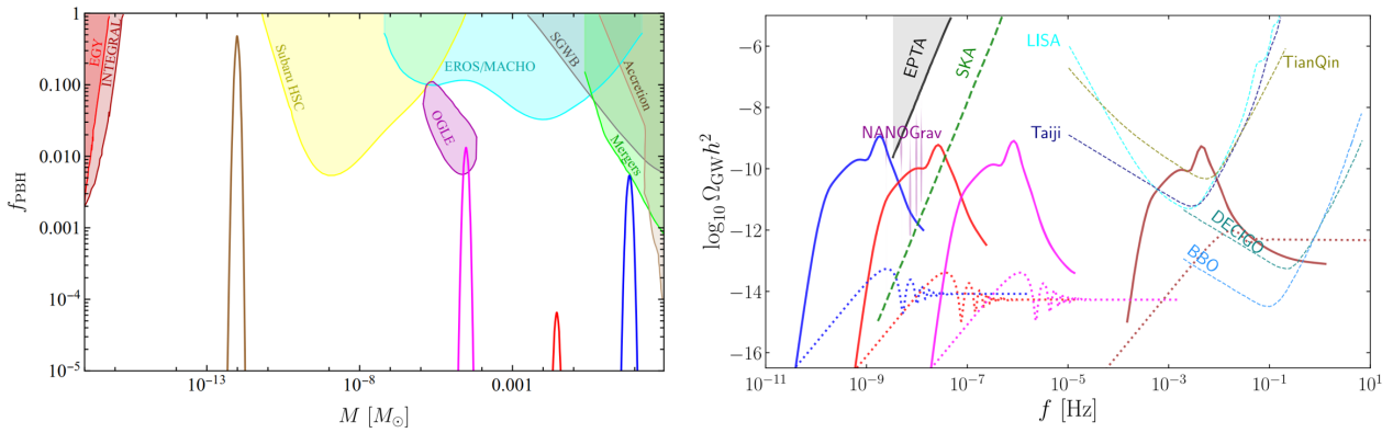 原初黑洞丰度(左)、标量诱导引力波与原初引力波能量密度谱(右)