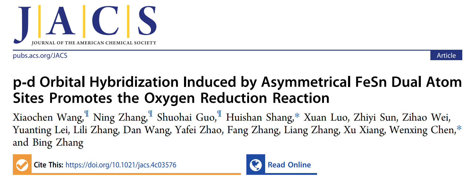 相关研究成果以“p-d Orbital Hybridization Induced byAsymmetricalFeSn Dual Atom Sites Promotes Oxygen ReductionReaction”为题,发表于国际权威期刊《Journal of the American Chemical Society》。论文第一作者为王孝臣硕士,通讯作者为尚会姗副研究员和北京理工大学陈文星副研究员。