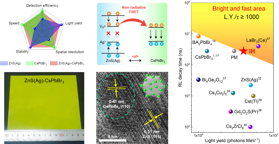 针对CsPbBr3QDs闪烁体光产额低、制备工艺兼容性差的问题,best365英国在线体育官网杨智、宋继中等设计了一种多位点ZnS(Ag)-CsPbBr3异质结,提出了原位固相合成策略制备异质结闪烁体。基于光谱匹配和短D-A距离特性,通过稳态RL光谱进化,瞬态吸收和瞬态PL谱证明了ZnS(Ag)给体到CsPbBr3受体发生了高效的福斯特共振能量转移(FRET),使得异质结闪烁体获得了光产额40,000 photons/ MeV,明显高于直接物理混合闪烁体的30,000 photons/MeV,证明了FRET导致的辐射增强可以在一定程度上弥补自吸收光损失。同时异质结闪烁体具有36 ns的快发光衰减时间和高的空间分辨率30 lp/mm。基于高光产额、快发光和高分辨成像的优势,异质结闪烁体展示了优异的高速动态X-ray成像性能,模拟了医学高速血管造影,在200帧/秒的速度和10 mGyairs−1剂量率下观察到11 cm/s的碘对比剂液流速度。该工作为设计和制造高性能异质闪烁体提供了新的方案,展示了兼具快和亮的闪烁体在实时X射线成像中的重要作用。