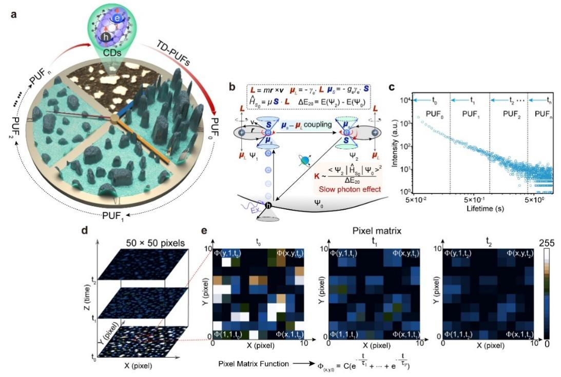 研究团队受量子力学中“波函数随时间演化”的启发,创新性地利用具有长寿命三重态激子的碳点(CDs)构建了含时物理不可克隆函数(TD-PUF)。该TD-PUF可随时间动态演化,生成多个不可复制的密钥模式,显著提升了系统的复杂性和防伪能力。团队进一步提出像素矩阵函数(PMF),以数学模型刻画PUF在时空维度的动态行为,使其编码容量提升五个数量级。