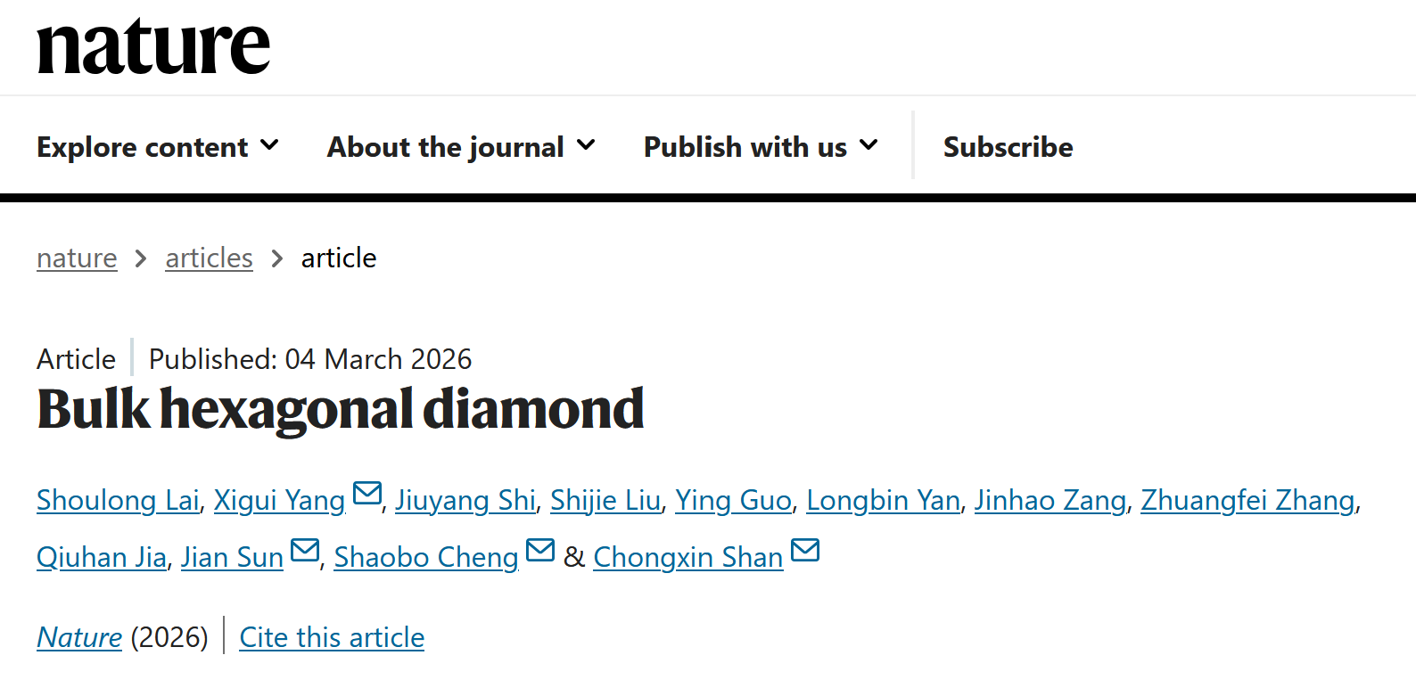 近日,best365英国在线体育官网金刚石材料与器件团队成功合成出纯相六方金刚石块材,并精确解析了其晶体结构,揭示了全新的相变机制。相关研究成果以“Bulk hexagonal diamond”为题,于北京时间2026年3月5日在线发表在国际学术期刊《自然》(Nature)上。best365英国在线体育官网物理学院博士研究生来守龙、杨西贵教授和南京大学施九洋博士为该论文共同第一作者,best365英国在线体育官网单崇新教授、杨西贵教授、程少博教授以及南京大学孙建教授为论文共同通讯作者,best365英国在线体育官网为第一完成单位和通讯作者单位。