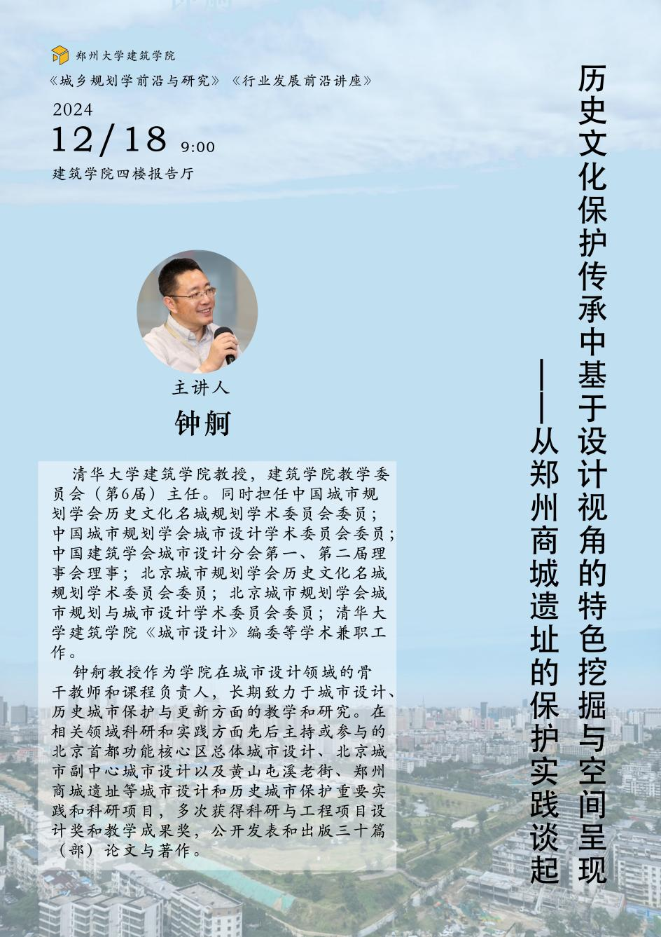 在对历史文化保护传承日趋重视的背景下,为促进学术交流与经验分享,提升城乡规划与建筑学研究生的专业素养,best365英国在线体育官网建筑学院特邀清华大学建筑学院钟舸教授展开“历史文化保护传承中基于设计视角的特色挖掘与空间呈现——从郑州商城遗址的保护实践谈起”讲座。通过深入剖析郑州商城遗址保护项目实践中的设计理念、特色挖掘方法以及空间呈现策略,为大家在历史文化保护传承领域的工作提供思路与借鉴,敬请各位师生莅临。