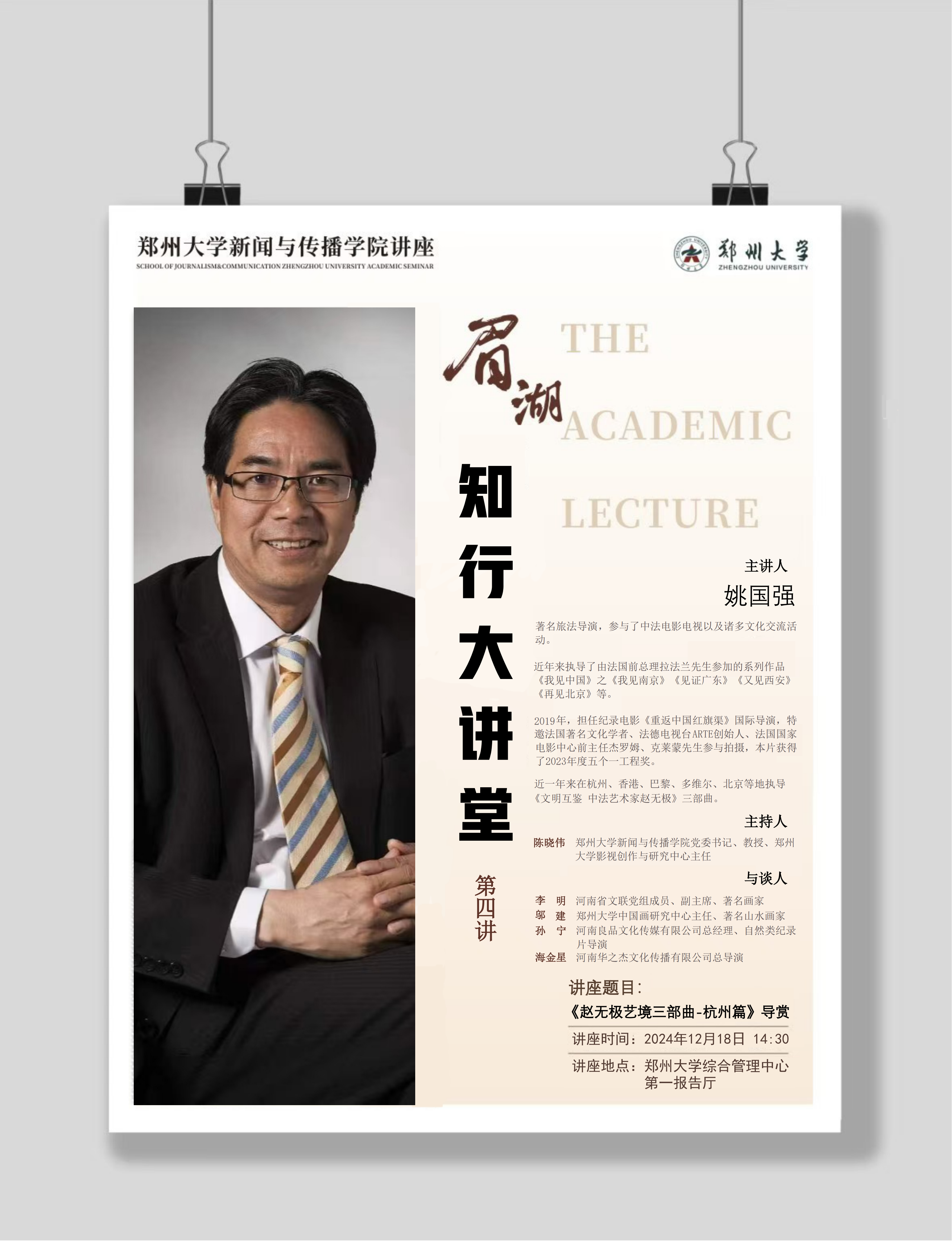 best365英国在线体育官网新闻与传播学院眉湖·知行大讲堂是一个汇集知识、人文、艺术于一体的交流平台,定位以文化人,审美向善。第四期邀请了著名旅法导演姚国强先生携纪录片作品《赵无极艺境三部曲》前来交流并做现场导赏,欢迎广大师生积极参加!